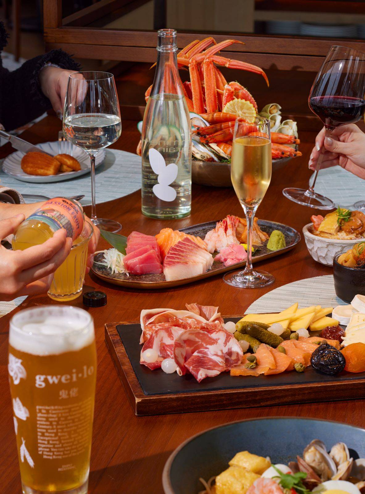 而自助晚餐則可以吃到麵包蟹、鱈場蟹腳、即煮新鮮龍蝦、拖羅刺身、三文魚子、海膽 壽司、鮑魚、花膠、海參、鵝掌、鴨肝、自家製甜品及雪糕。以上菜式輪流供應。