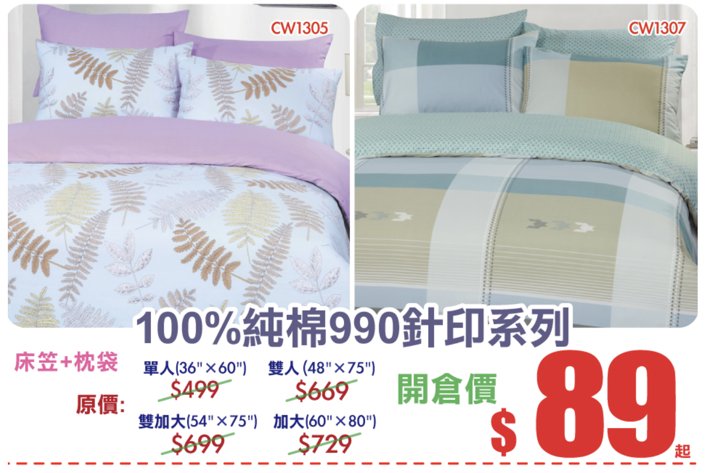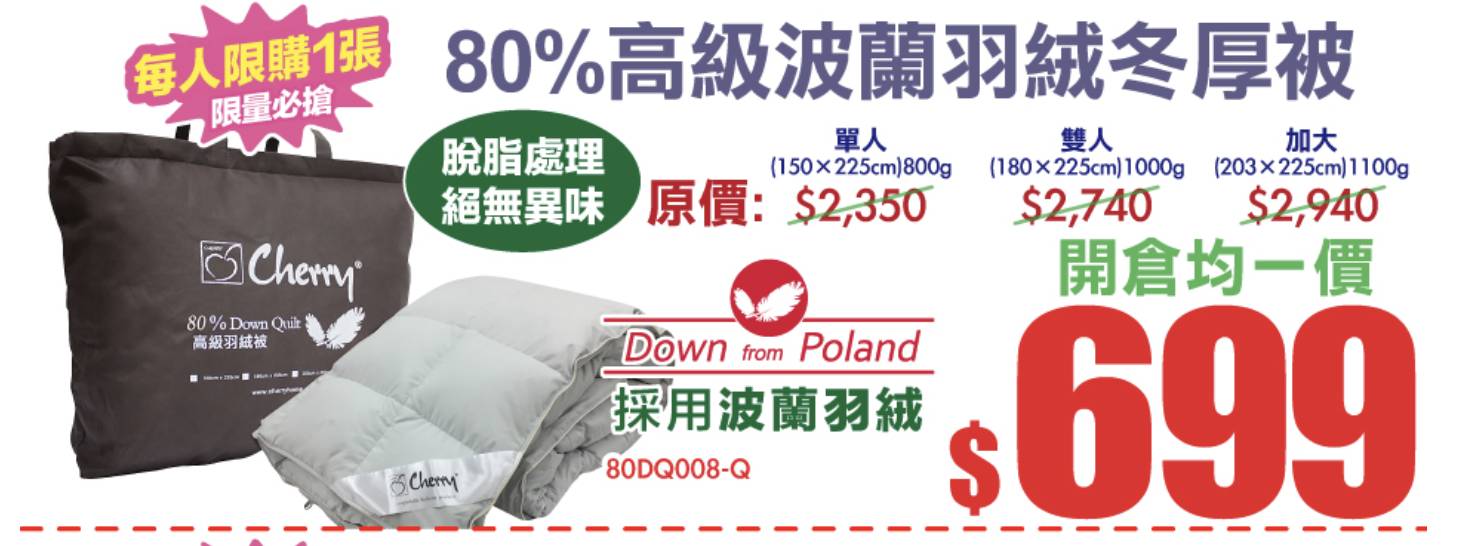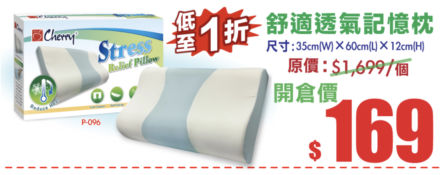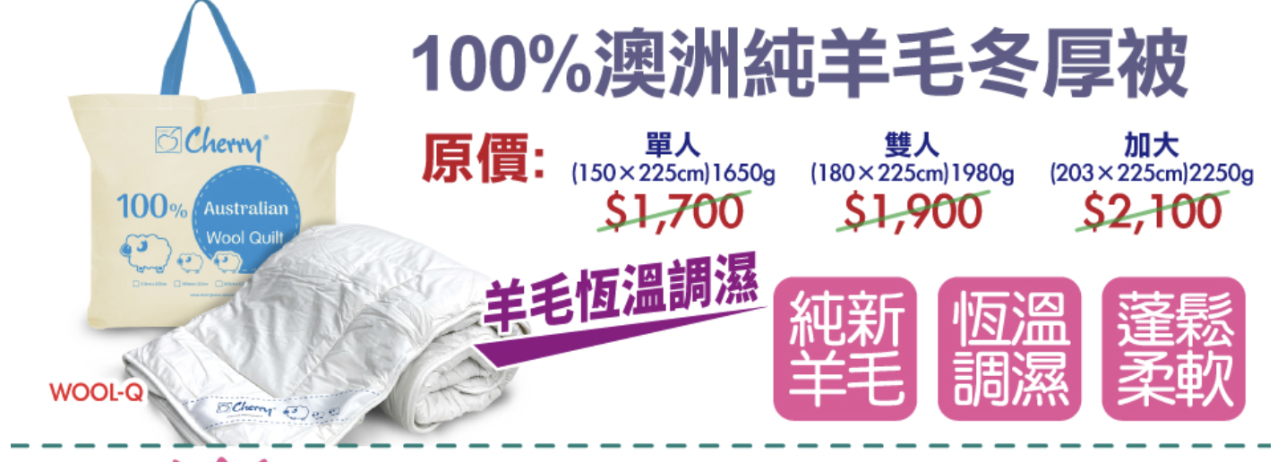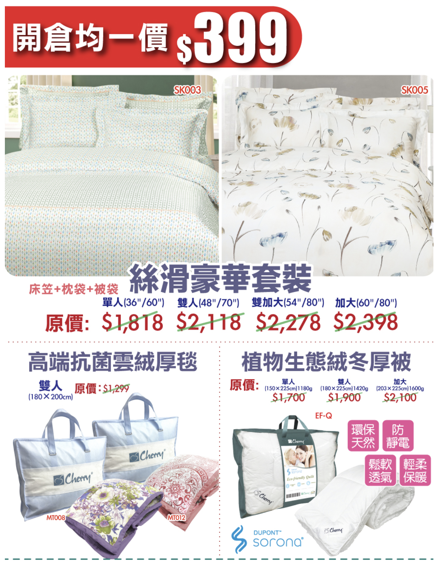仲有兩星期左右就過年,都會置下家品、寢室用品過新年,咁就啱啦,床具品牌 Cherry 搬遷清貨,1 月 3 日至 13 日會在土瓜灣開倉,唔少產品都劈價清倉,好似平日買 $499-729 的床笠連枕袋,激減至 $89 起,記憶枕更係大激減,由 $1699 減至 $169,而且有多款不同類型選擇。近排天氣經常轉冷,反厚被當然少不了,高級大豆蠶絲被、100%澳洲純羊毛被、80% 波蘭羽絨被、抗菌絨厚毯、90%瑞士抗菌專利白鵝羽絨被低至 $299 起發售。