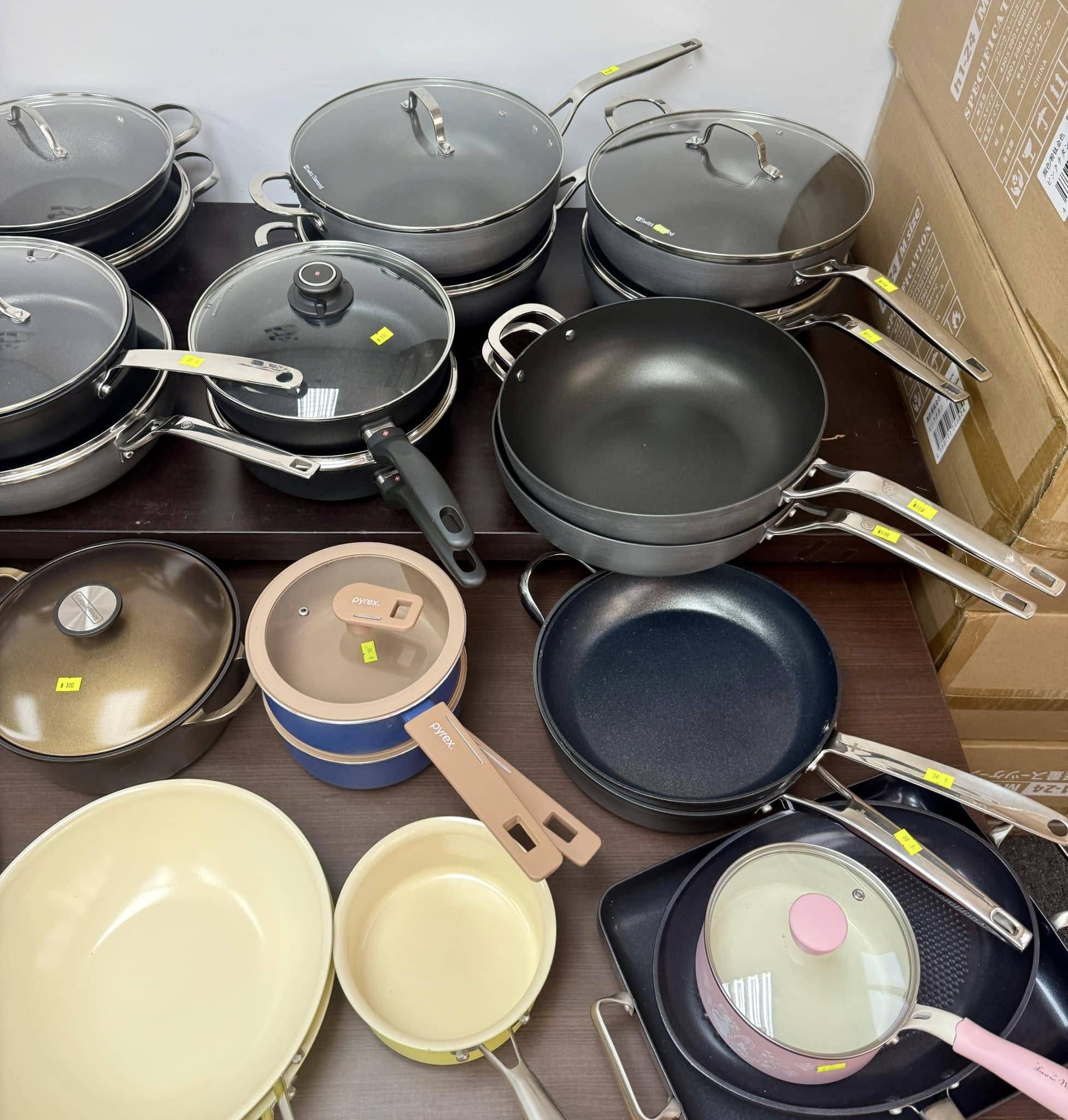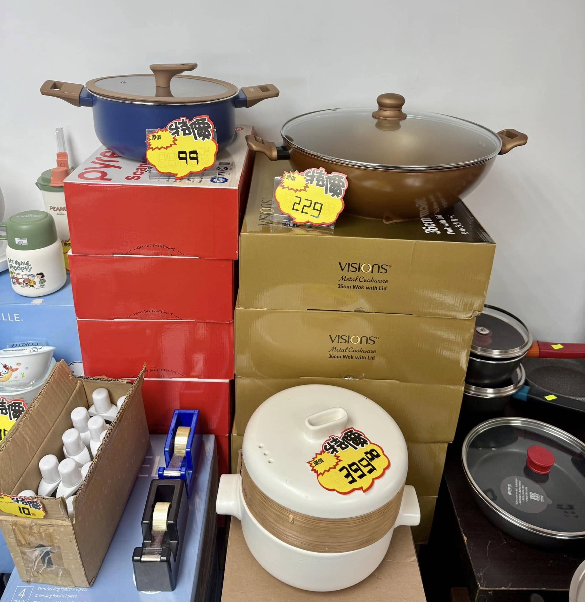 廚具品牌不少,像康寧的碗、餐具及砧板等,當中還有姆明、Snoopy 及 Hello Kitty 餐具套裝;Swiss Diamond、煮食鍋及鑊;Pyrex 陶瓷鍋及鑊、Vision 中式鍋、透明玻璃鍋;Mash 餐盒等。