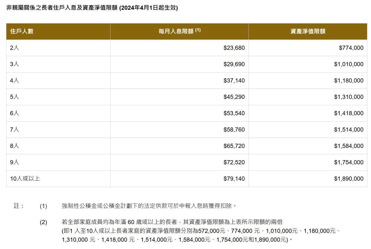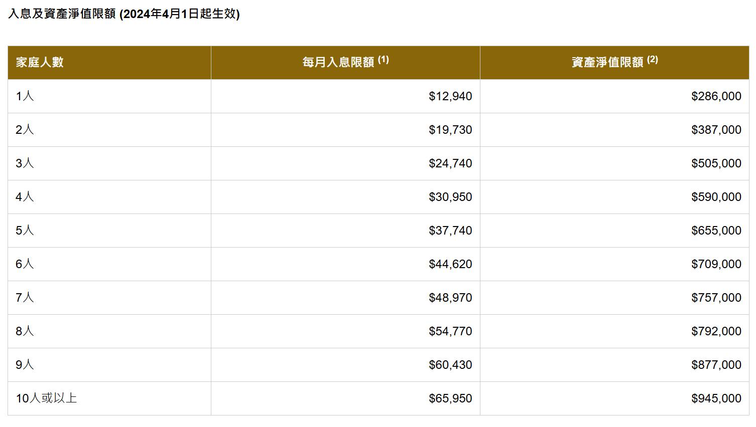 - 申請者及其家庭成員的總每月入息和總資產淨值不得超過現行的限額。