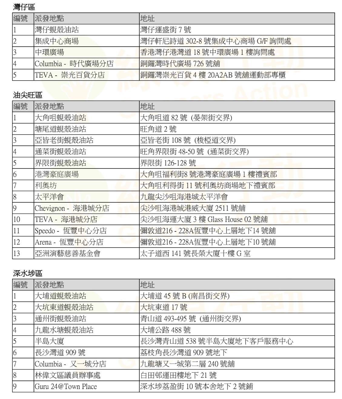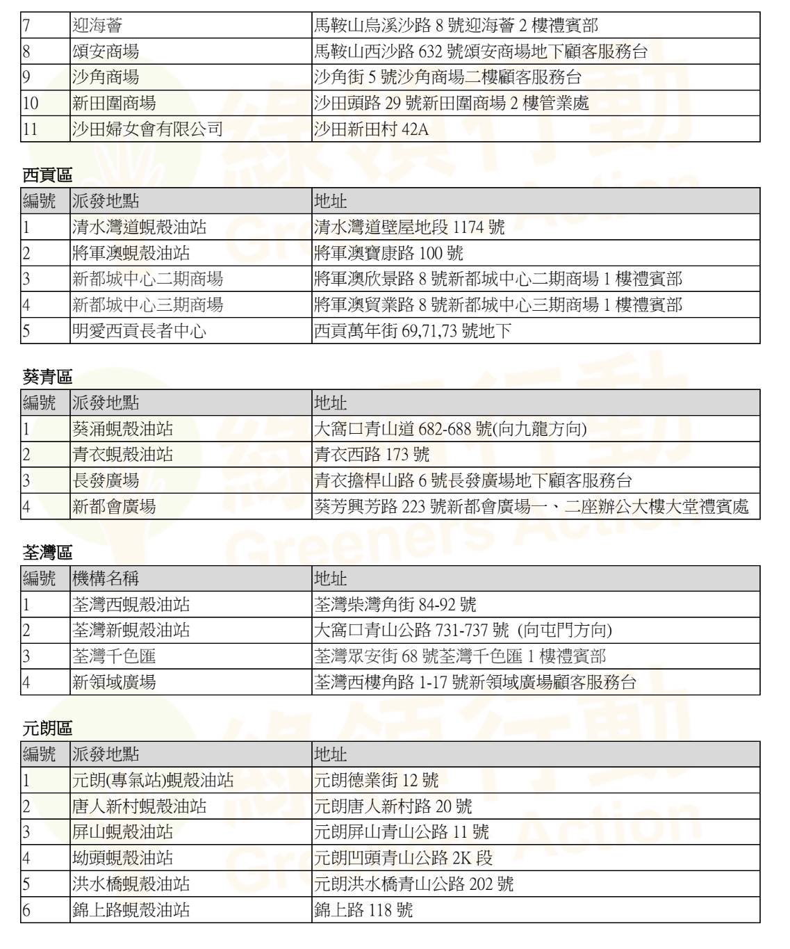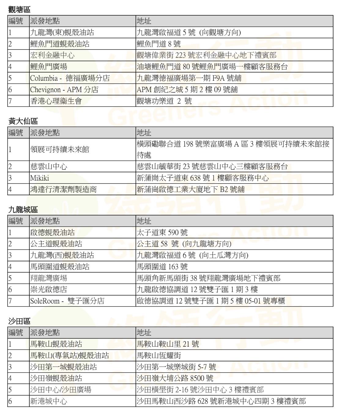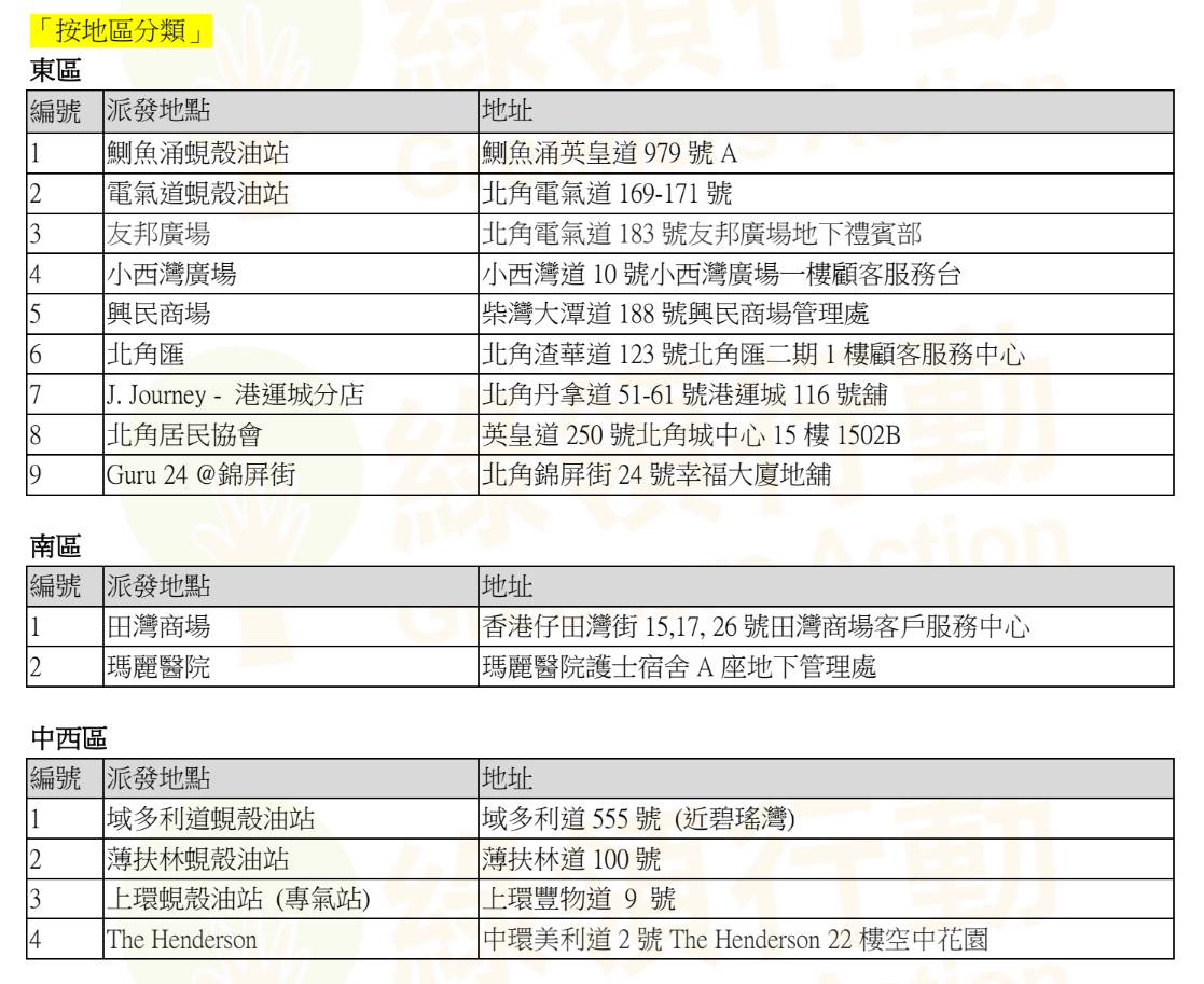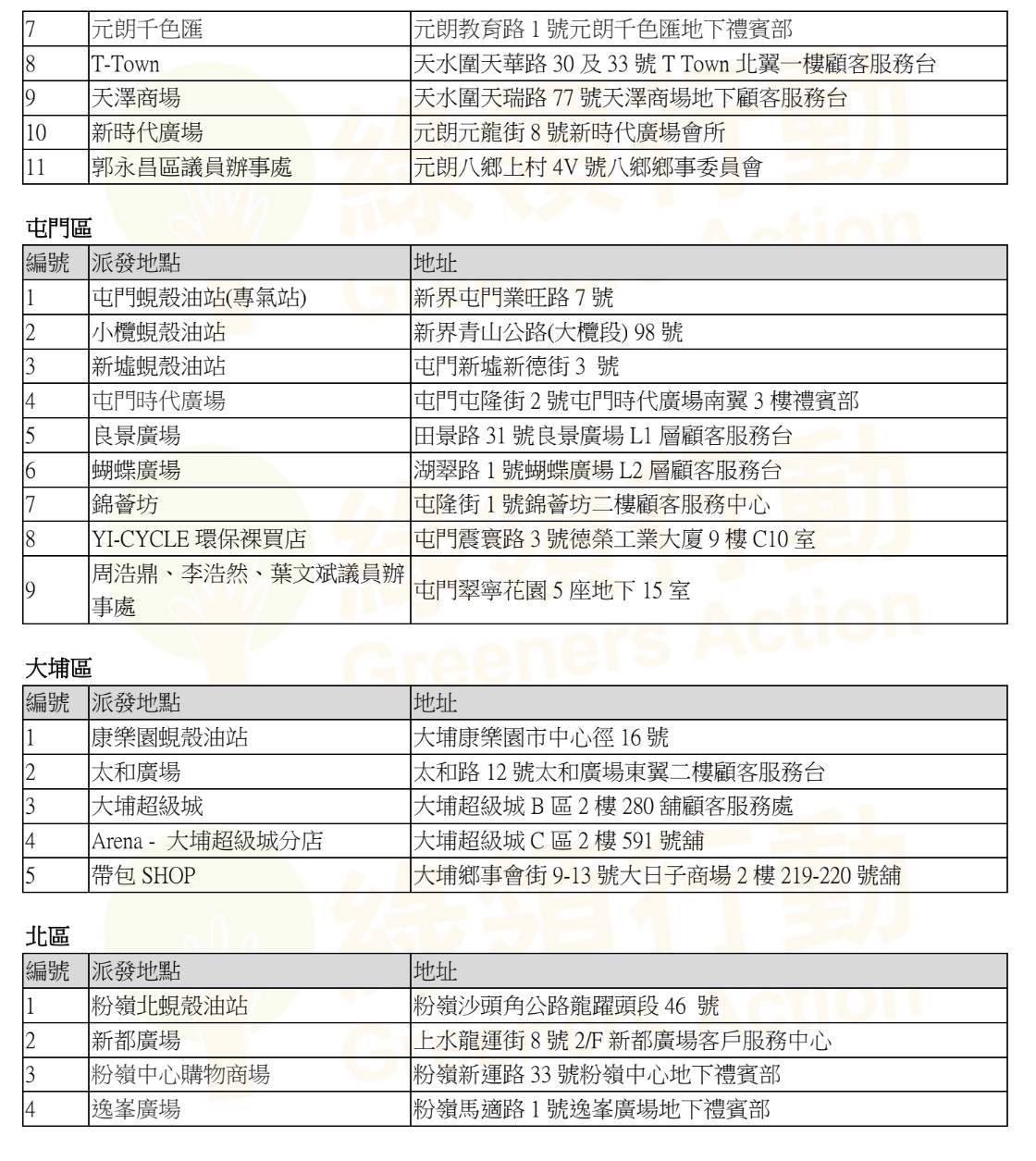 綠領行動共提供118個地點以便市民免費索取新生利是封,利是封由1月15日至28日派發,數量有限,派完即止。派發地點的營業時間視乎個別機構而定,敬請留意。