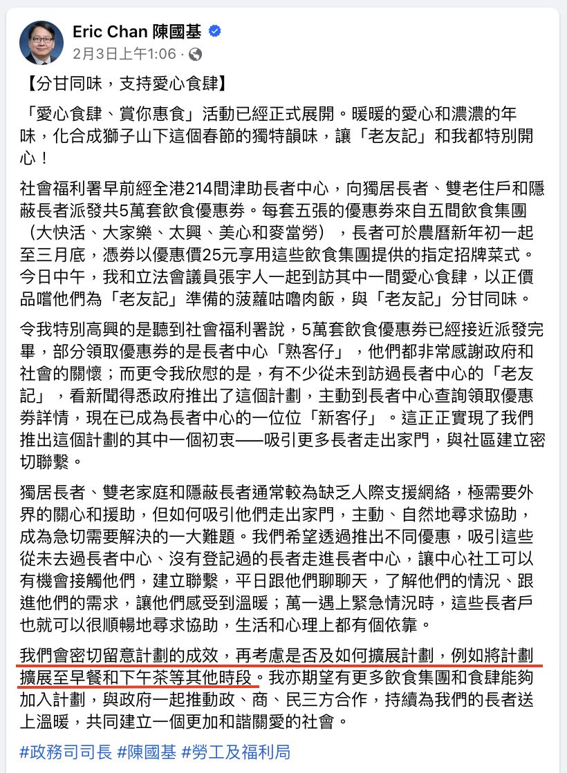 上月政府宣布與5間連鎖飲食集團推出的「愛心食肆賞你惠食」計劃﹐向全港長者派發一套5張$25飲食優惠券。政務司司長陳國基在其Facbebook透露社會福利署表示:5萬套飲食優惠劵已經接近派發完畢,有鑑長者們反應熱烈,司長表示有意加碼!