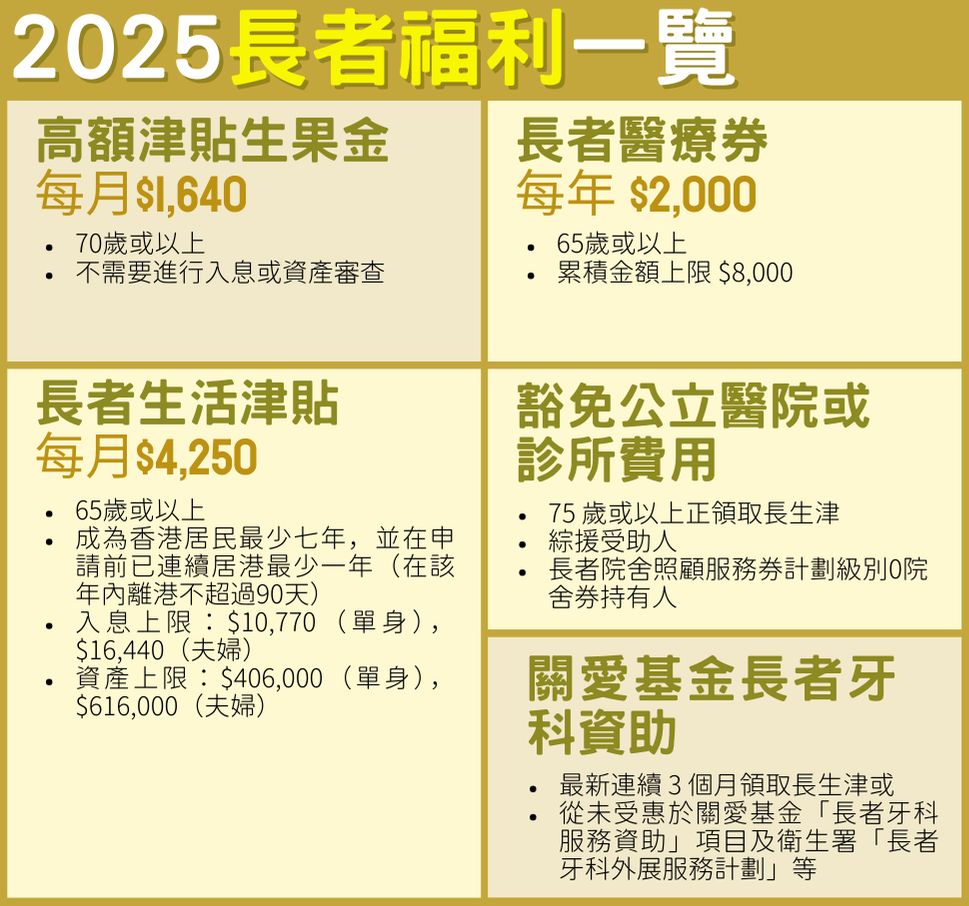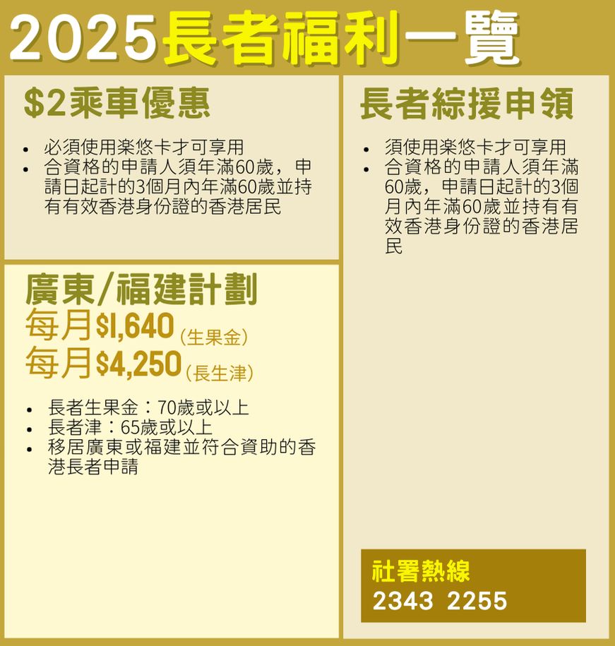 下文列出了2025年最新的主要長者福利金額,即刻睇下你或你家的長輩可享的福利,申請漏了記得快點申請。有關各款長者福利再進一步詳情、申請方法或查詢,可致電社署熱線2343 2255。