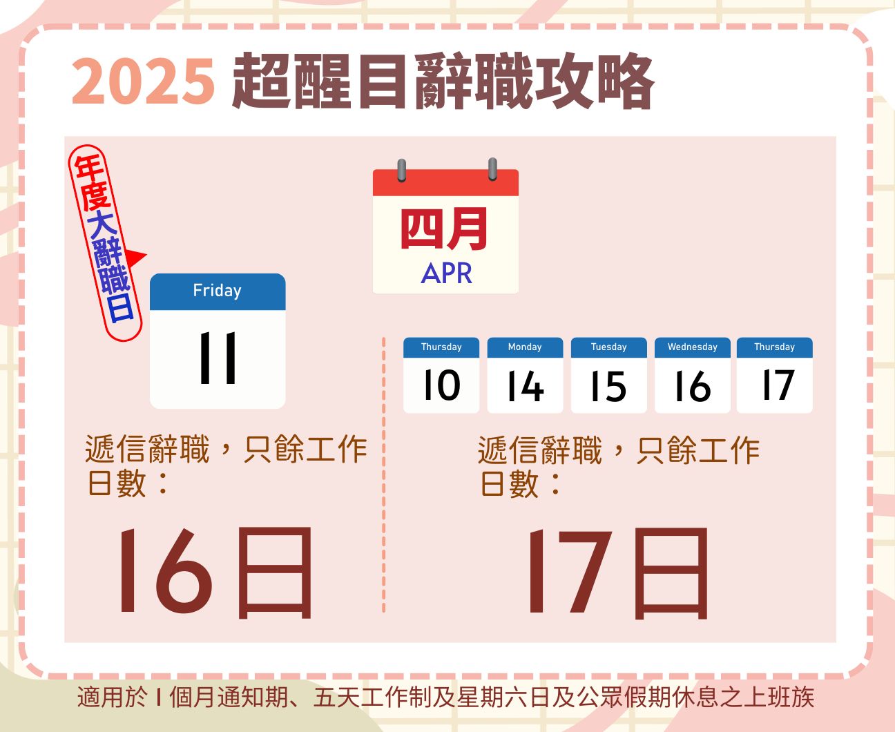 1️⃣ 4 月|⭐ 4 月 11 日為「年度大辭職日」⭐,該日遞信只餘 16 個工作日;4 月 10、14-17 日遞信,只餘 17 個上班日