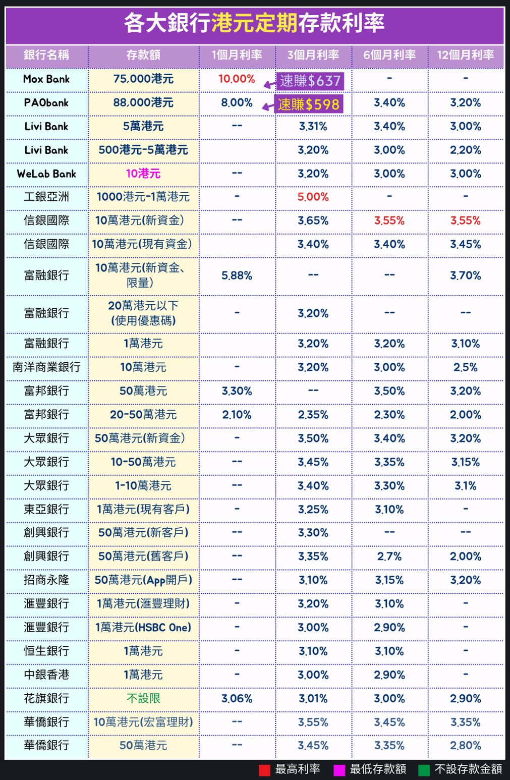 💡申請方法:適用於3月31日前,以邀請碼「MOXBONUS」開戶的新客戶(過去12個月內未持有Mox戶口),並於開戶後 7 天內開立 75,000 港元 1 個月定存;優惠分為0.88%基本息率及581元現金獎賞,總利息約 637 元