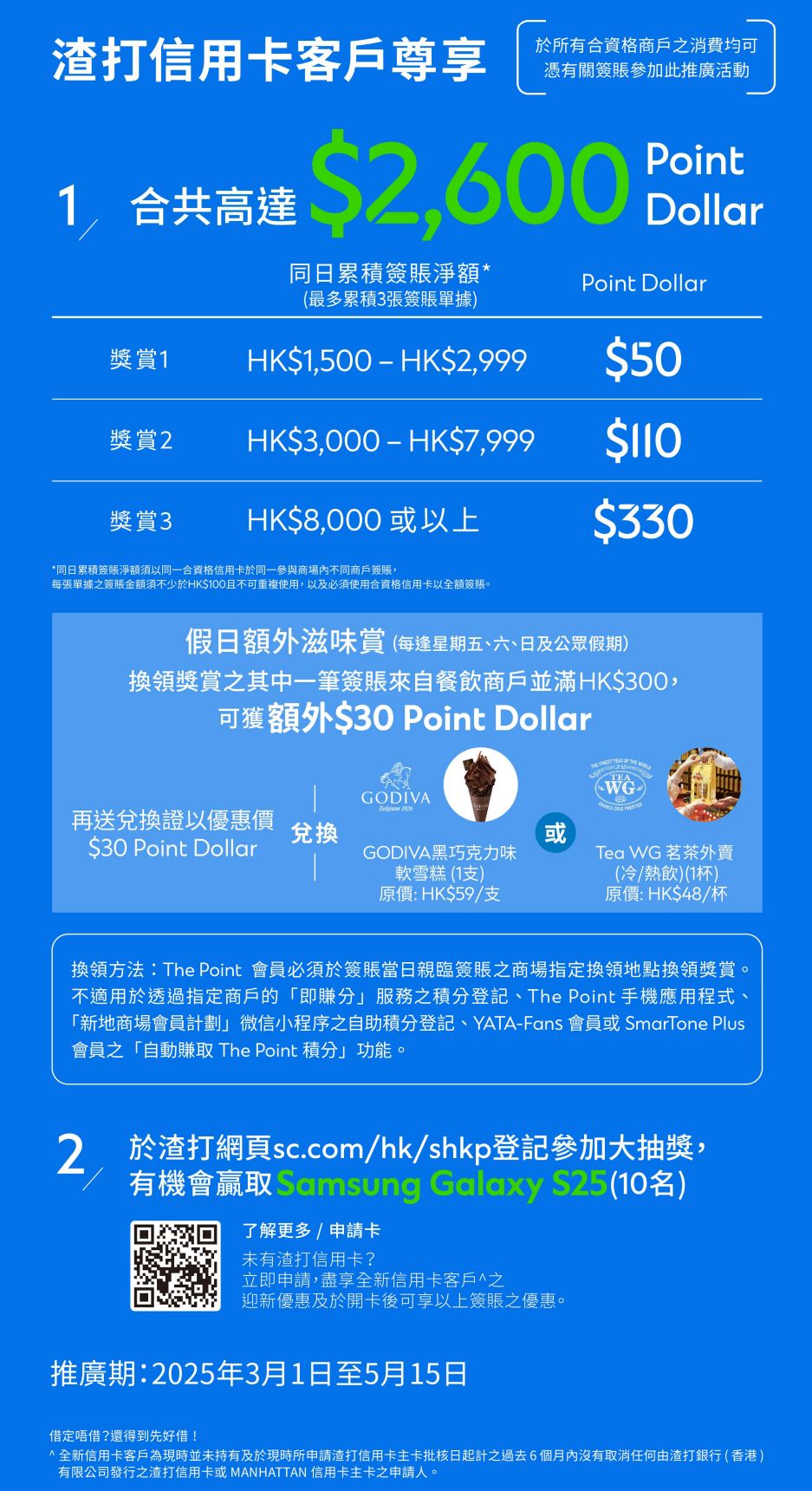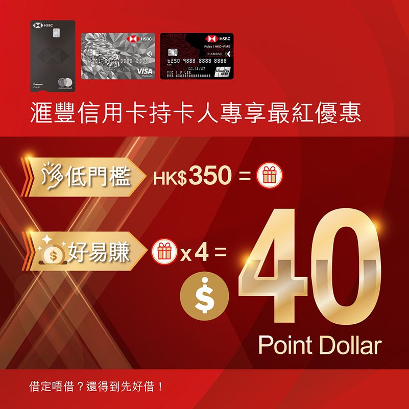 The Point會員憑滙豐信用卡即日單一簽賬淨額滿港幣350元,可獲取1個電子印花,於每個階段之推廣期每收集滿4個印花(即4次簽賬合共低至港幣1,400元),即可換領$40 Point Dollar。