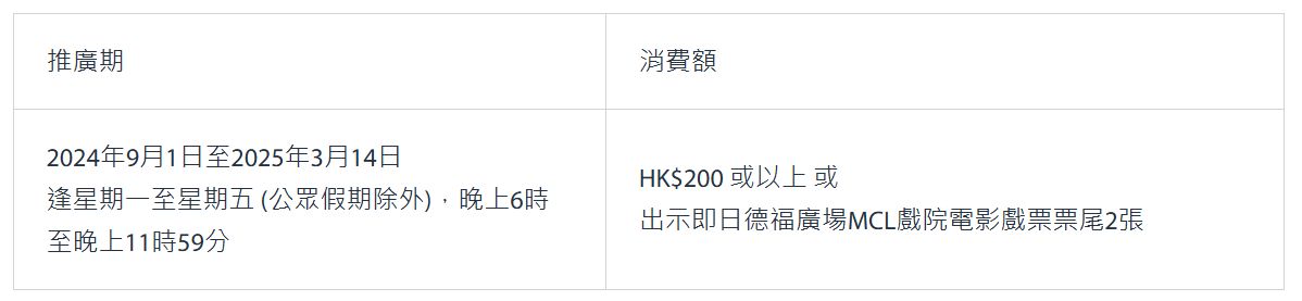 - 「After 6 · 夜泊賞」推廣期內,車輛凡於星期一至星期五(公眾假期除外)晚上6時至晚上11時59分於德福廣場的指定停車場泊車,並以電子消費滿港幣200元或出示2張即日德福廣場MCL戲院電影戲票,即可享泊車優惠。(最多可享4小時)