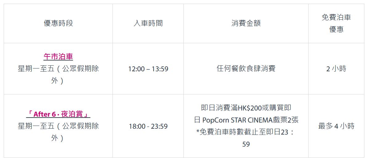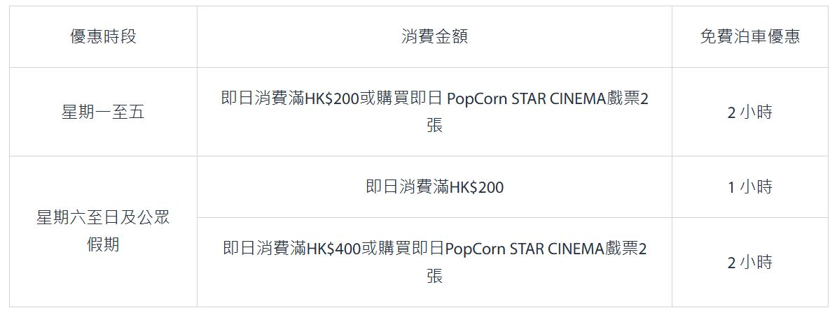 - 於星期一至五到時代廣場電子消費滿港幣$300或以上(即日單一機印收據),即可獲得3小時免費泊車;星期六、星期日及公衆假期,可獲2小時免費泊車。