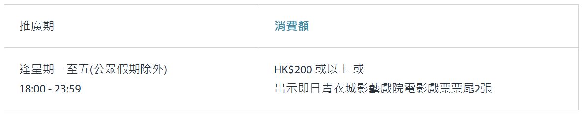 包括觀塘apm、屯門卓爾廣場、薄扶林置富南區廣場、將軍澳東港城、北角匯、沙田 HomeSquare、屯門錦薈坊、上水廣場(只適用於2樓至5樓商戶)、葵芳新都會廣場、上水新都廣場、新蒲崗Mikiki、旺角MOKO新世紀廣場、柴灣新翠商場(新翠花園4樓商場商戶除外)、沙田新城市廣場、將軍澳中心、將軍澳PopWalk天晉滙、大埔超級城、荃灣荃錦中心及新領域廣場(視為同一商場計算;其中新領域廣場只適用於地下至2樓商戶)、荃灣廣場、大埔新達廣場、屯門V city、南昌V Walk、銅鑼灣wwwtc mall(只適用於地下至13樓商戶)、元朗YOHO系列商場(包括YOHO MALL形點、YOHO MIX元點及 YOHO PLUS加點,視為同一商場計算)及元朗廣場內的商戶作每張單據之簽賬金額須不少於HK$100,方可享有優惠。