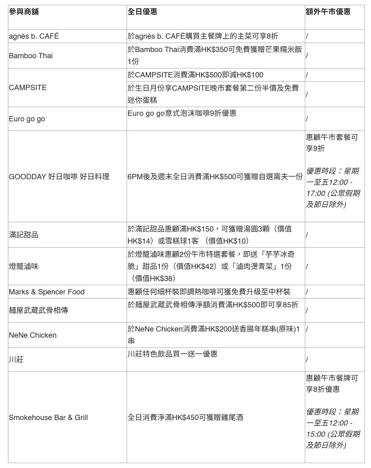 - 參加方法:於參與餐飲商戶單一消費滿HK$400,即可獲贈HK$40恒隆電子現金禮券