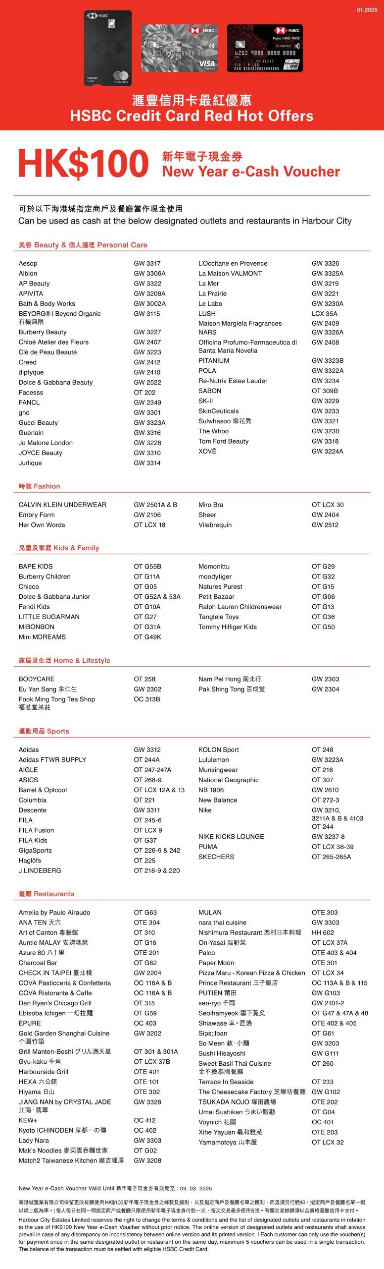 - 滙豐信用卡客戶專享$100新年電子現金券,指定商戶及餐廳名單:(10/1-9/3)