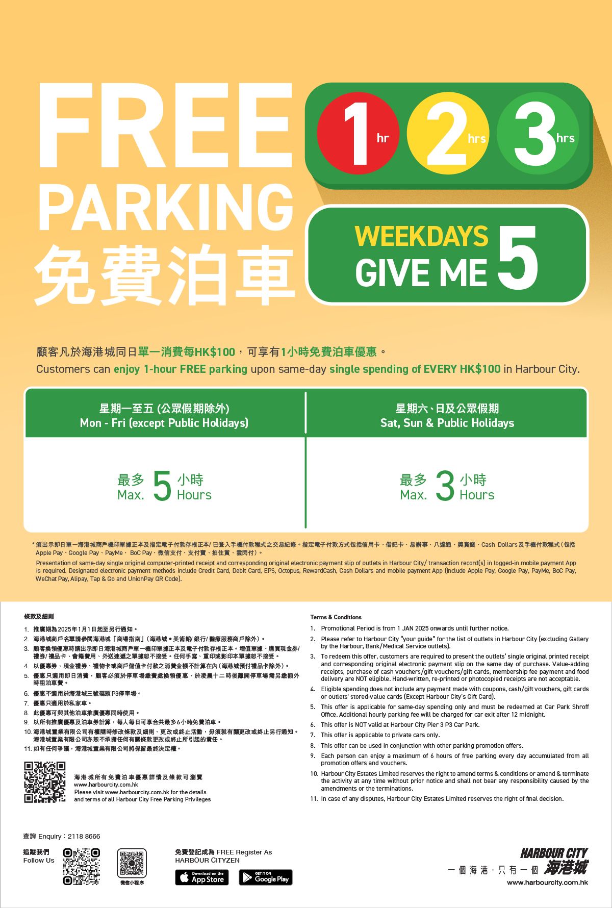 - 顧客凡於海港城同日單一消費滿$100,可享有1小時免費泊車優惠。(1/1/2025起至另行通知)