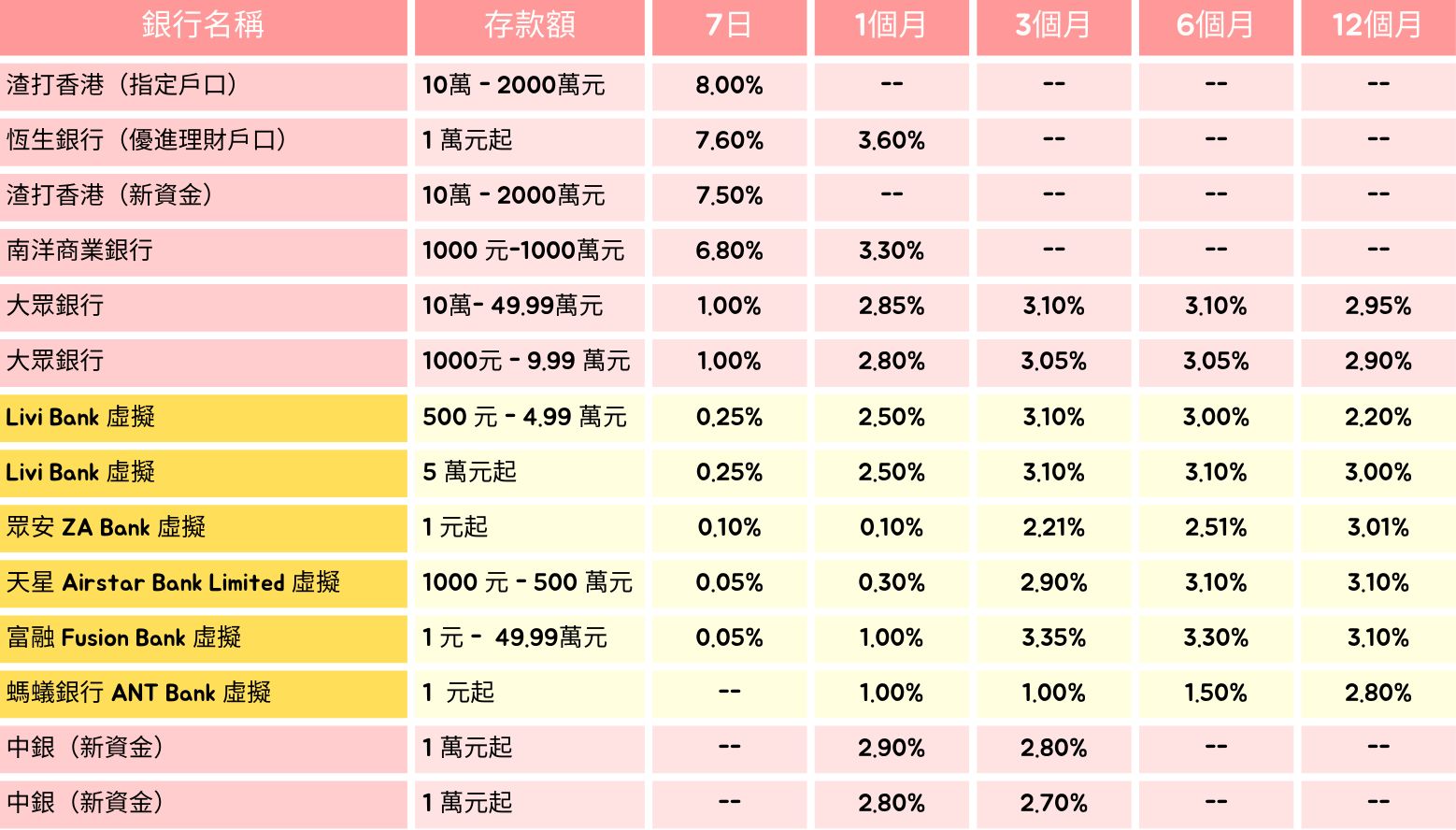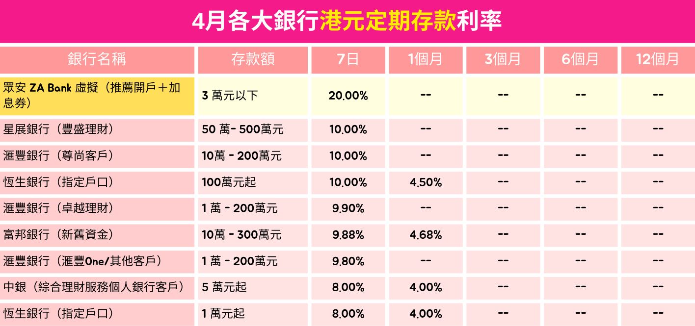 一銀行更驚現20%超高息戶口,另外不少銀行更提供10厘以及9厘以上的計劃(截至2025年4月2日資料),當中以滙豐最進取,小本資金1萬元都可以有10厘息,即睇攞高息的條件!文中亦有10大高息港元定期存款戶口推薦。