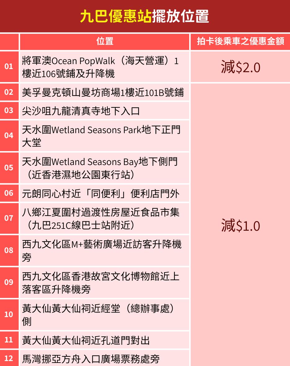 【車費優惠/九巴/九巴優惠站/交通優惠/節省交通費/慳錢攻略】今年不少公共事業都加價,但隨着經濟下滑,人工無加,失業率又升,市民真係要慳得就慳,尤其是每日要乘巴士通勤的打工仔,九巴在全港12個地點就有「九巴優惠站」,拍一拍八達通,乘搭九巴車資最多減到$2,而其中2個地點更在廟宇之內,小數慢長計,每月工作日拍一拍卡,每月慳到差不多$50,即睇全港「九巴優惠站」擺放位置及減免額。