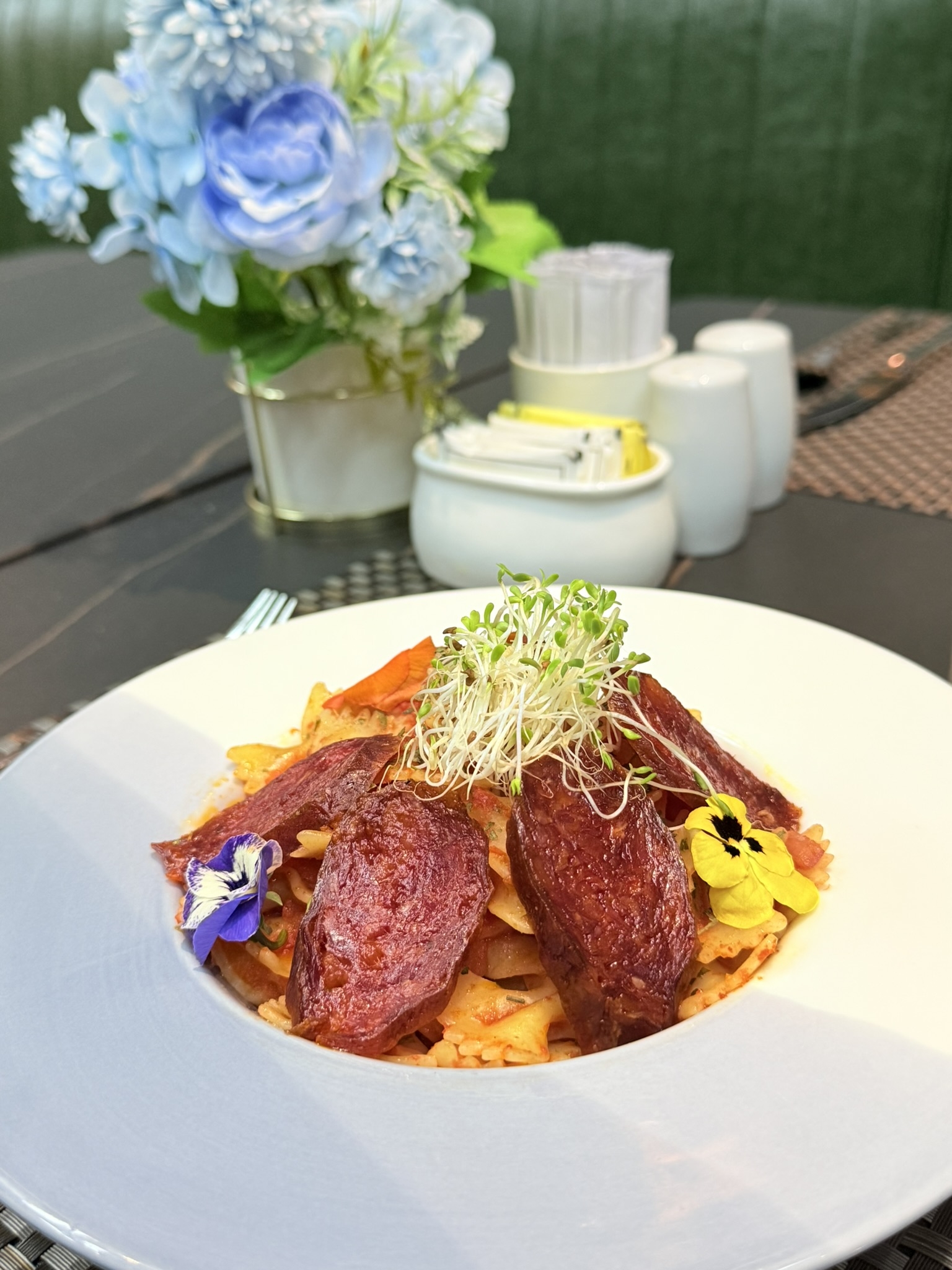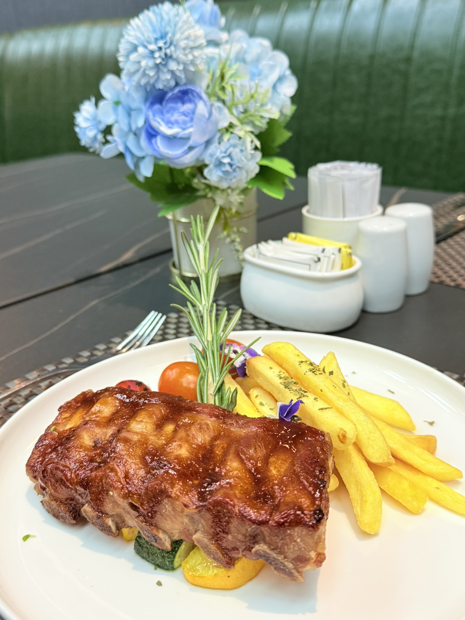 享用自助吧及精選主菜:香烤龍脷柳配乾蔥忌廉汁 / 醬烤豬肋骨 / 蕃茄香辣肉腸蝴蝶粉