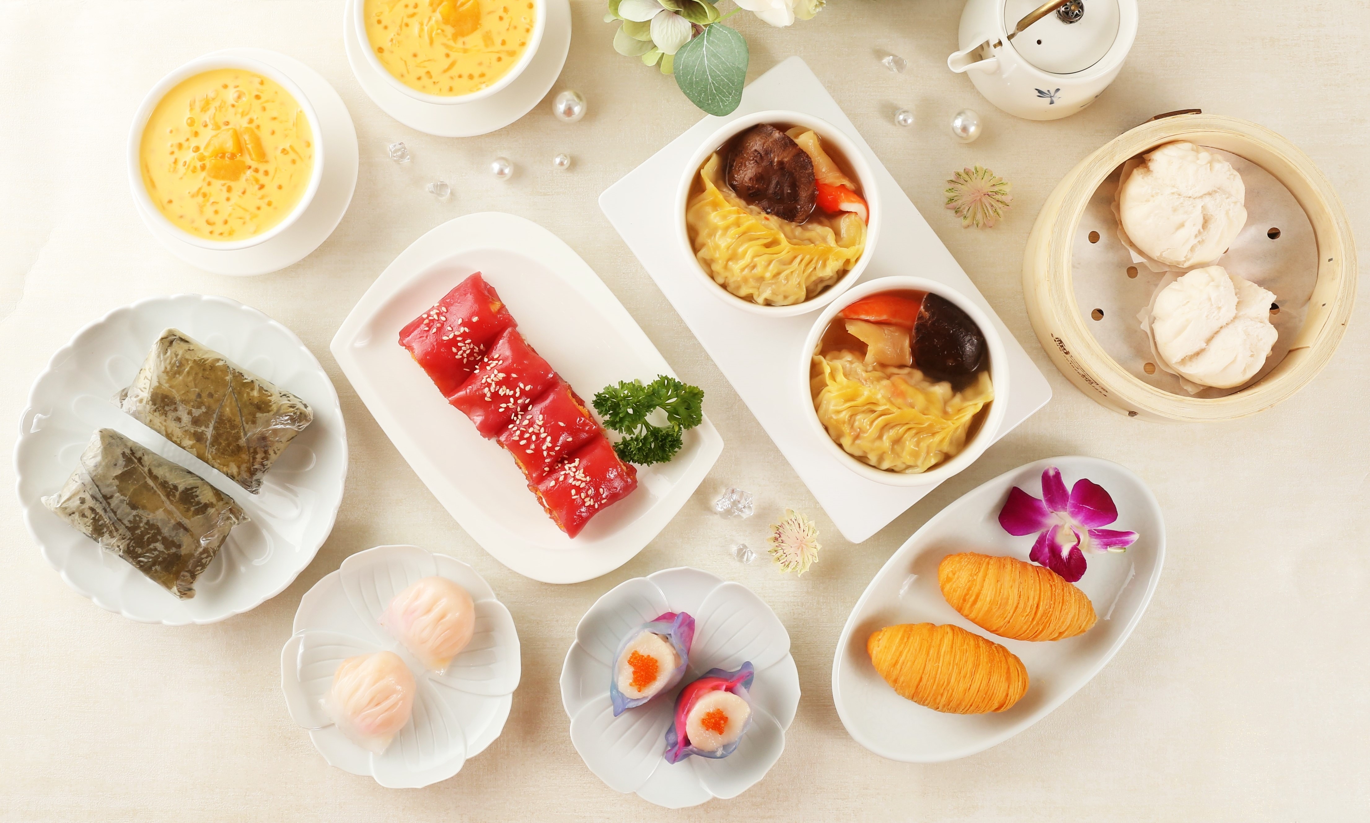 筍尖原隻鮮蝦餃、沙巴鮮蝦燒賣皇、鮑汁叉燒包、鮑汁柚皮鴨掌、豉蒜蒸鮮排骨、 姬松茸遼參粉果、山竹牛肉球、奶皇千層糕、咖哩蒸土魷、上湯魚肚鮮竹卷、鮮蝦菜苗餃、 黑椒牛仔骨、荷葉紅米珍珠雞、高湯花膠金錢灌湯餃、醬皇豉蒜蒸鳳爪、薑蔥牛柏葉、 蟠桃壽桃 (需時 15 分鐘)、鮑汁扣鳳爪