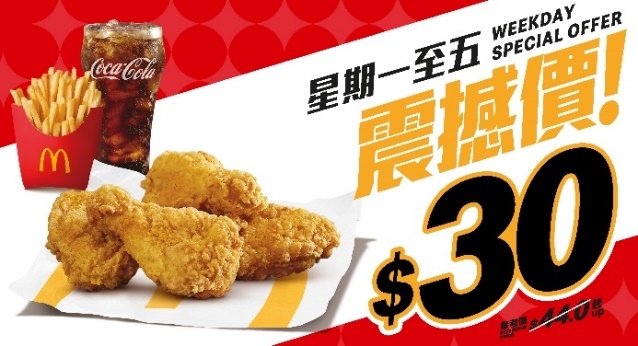 【麥當勞/飲食優惠/麥當勞APP優惠/麥當勞優惠套餐/慳錢攻略/飲食著數】麥當勞App星期一至五震撼價$30優惠將再度登場,下星期一至五(8月11至15日),使用麥當勞App,就可以享用3款限時$30震撼價優惠,包括脆香雞翼、脆辣雞腿飽及雙層豬柳蛋漢堡套餐,以上三款套餐亦可選擇以$6.5升級加大套餐、$9.5升級大大啖套餐,或以$9.9升級大大啖套餐配McCafé厚椰奶鐵。