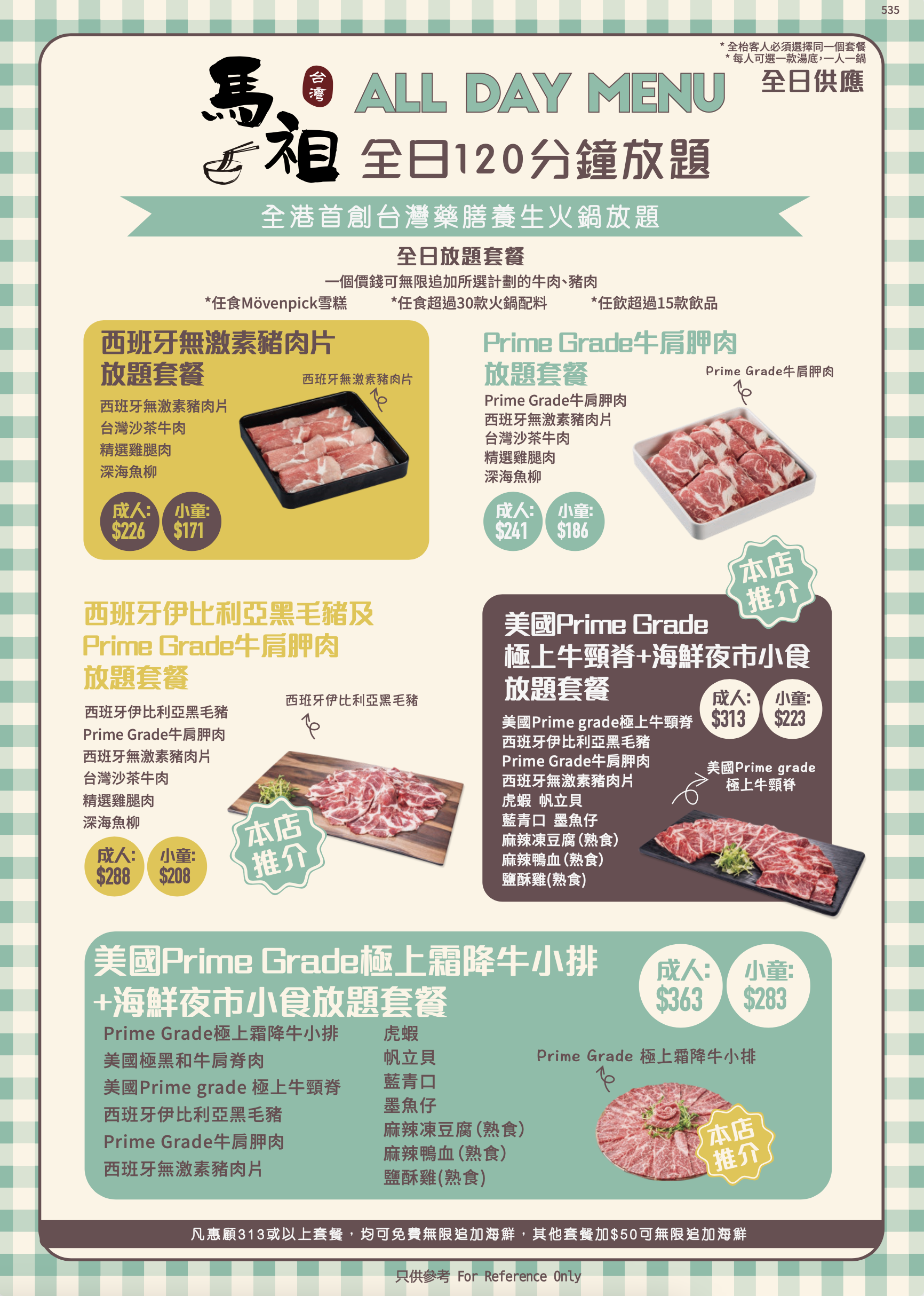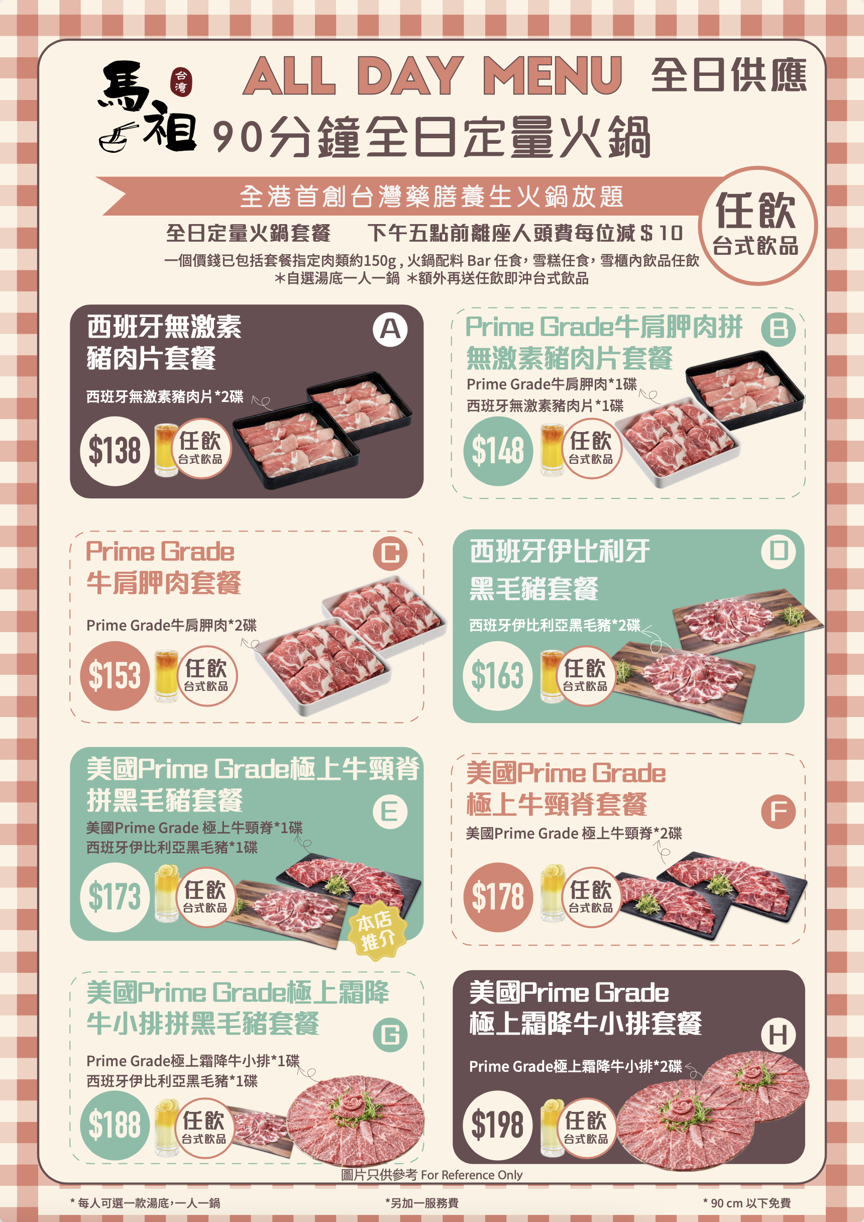 今次優惠原於銅鑼灣新舖開張,所以喺9月8-17日都可以享有買一送一著數,優惠包括「90分鐘全日定量火鍋」套餐及「全日120分鐘放題」套餐。前者全Menu一共有8款,包括西班牙無激素豬肉片套餐、牛肩胛肉套餐,以至最靚嘅美國Prime Grade極上霜降小排套餐。「定量火鍋」嘅意思係牛肉、豬肉係定量,每位都有兩碟,而喺配料區嘅配菜可以任食。不過最激嘅係平日廿幾三十蚊杯嘅台式飲品,呢度套餐包任飲。至於120分鐘火鍋放題,一共有5款套餐,以最平嘅西班牙無激素豬肉片放題套餐計算,套餐HK$226有買一送一優惠,加一服務費後,平均每位HK$124.5就可以連肉類都任食,好平呀!