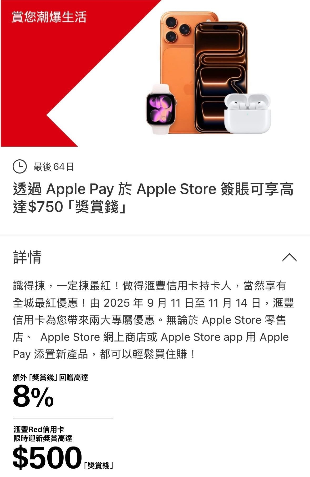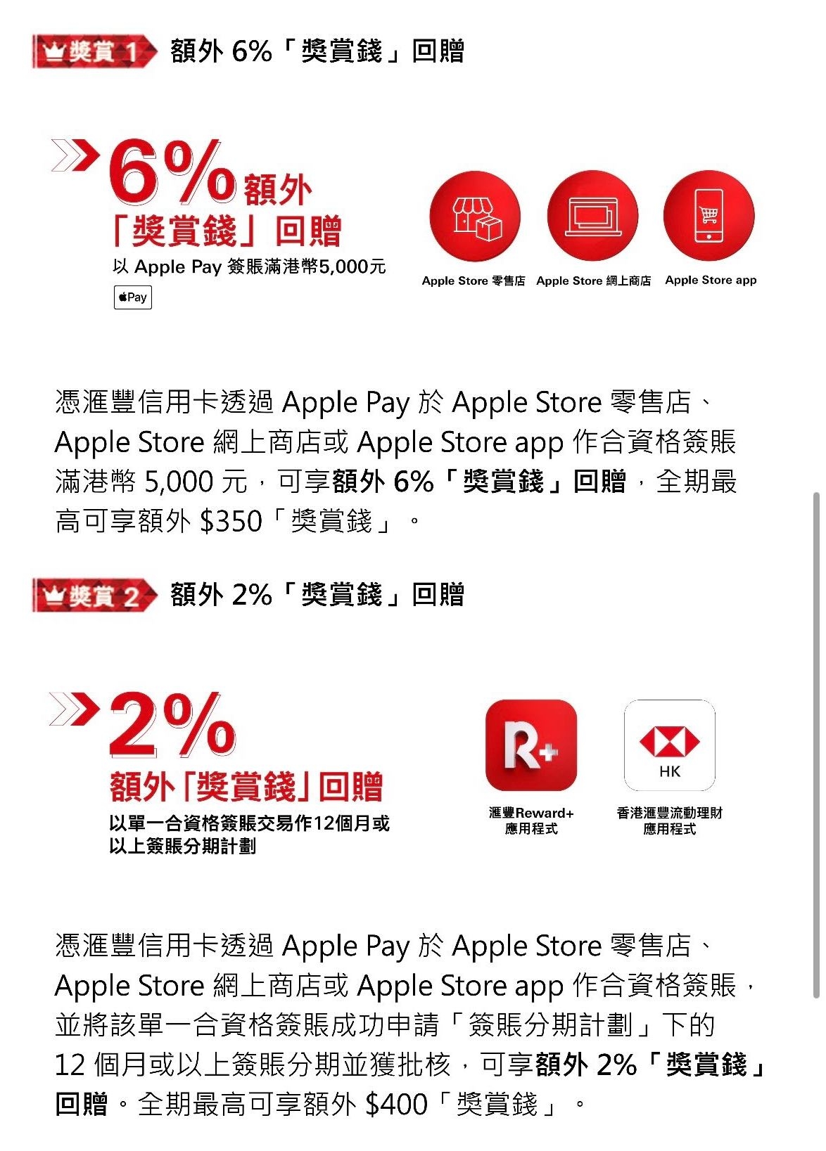 用滙豐信用卡透過 Apple Pay 喺 Apple Store(門市、App 或官網)單一簽賬滿 HK$5,000,即享回贈