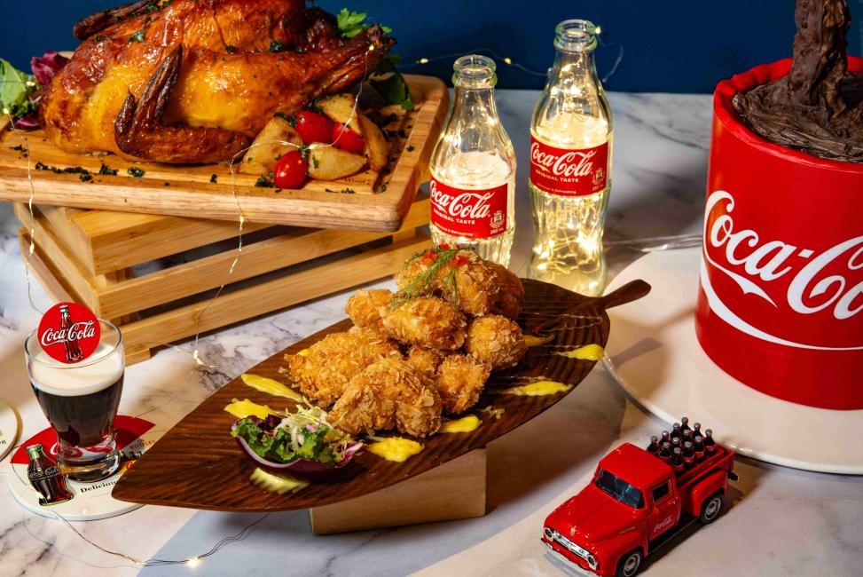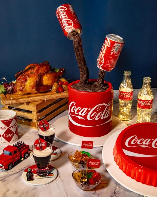 【主題美食】七味燒春雞、星洲黃金麥皮蝦、可樂醉雞翼、黃金蟹肉薯餅配可樂柚子醋汁、檸檬可樂糖醋骨、可樂慢煮和牛面頰配黑松露野菌汁、瀑布可樂黑森林蛋糕 、可樂蓋掩蛋糕 、懷舊可樂遮仔啫喱