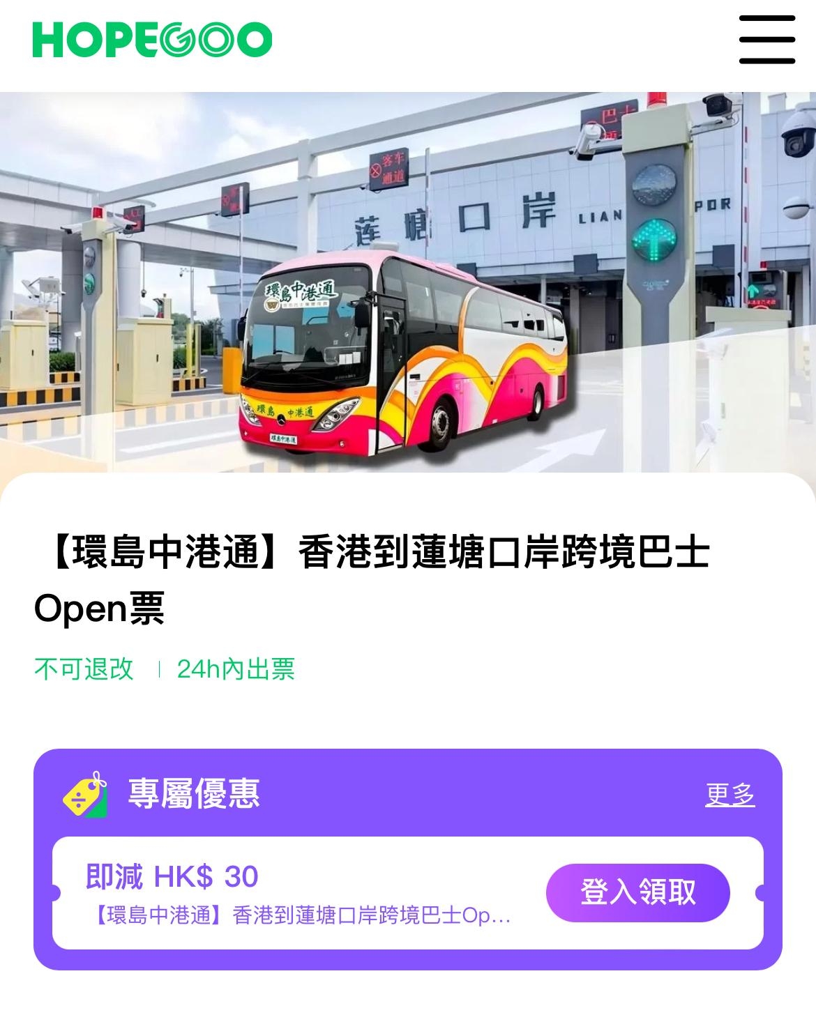 此優惠由旅遊平台Hopegoo提供🎟️(點擊此連結查看),平台派發即減$30優惠券,乘客於以下4個指定上車地點乘坐環島中港通巴士前往蓮塘口岸,車費即可低至$10一程。