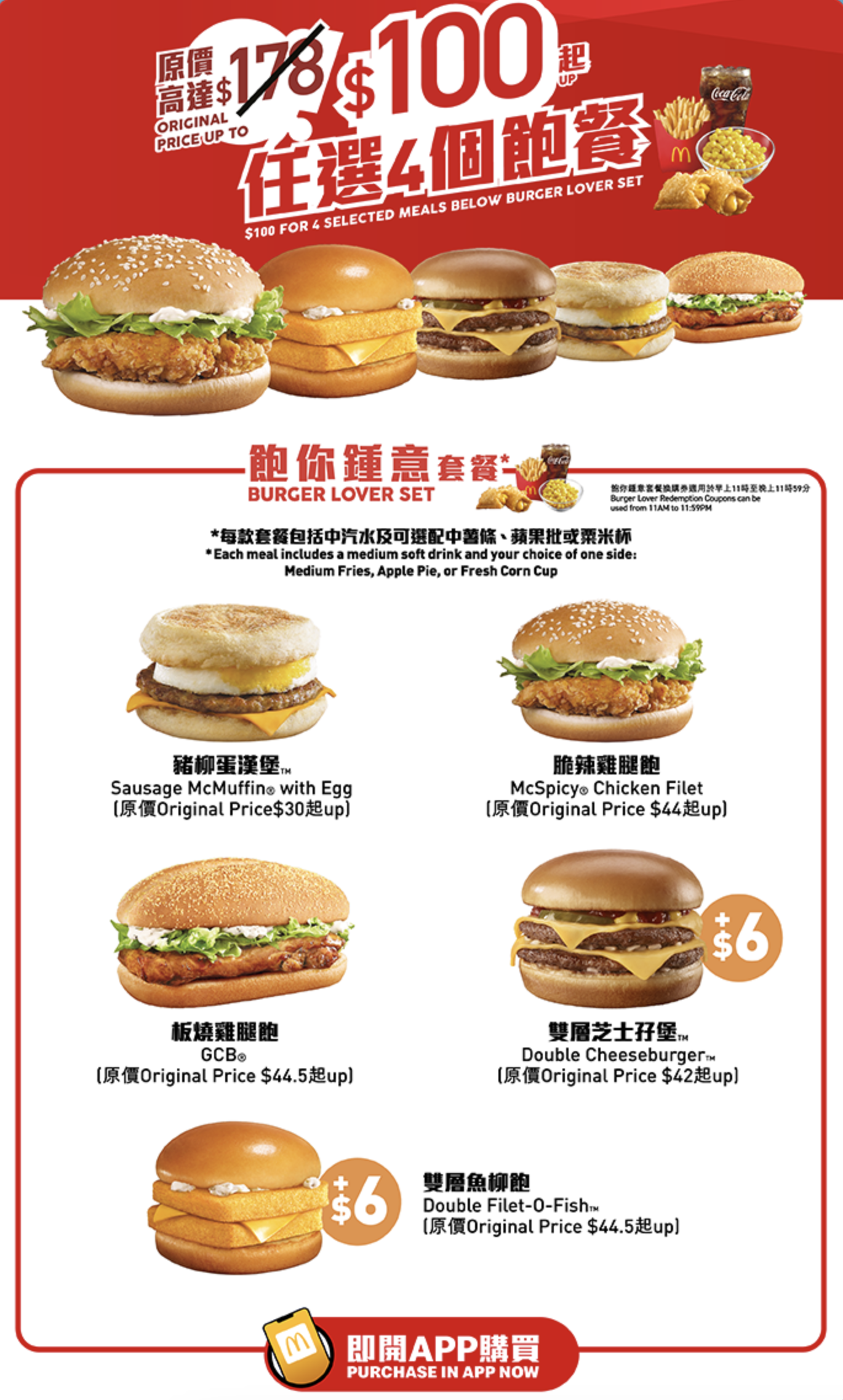 豬柳蛋漢堡套餐、脆辣雞腿包套餐、板燒雞腿包套餐、雙層芝士孖堡套餐、雙層魚柳包套餐、豬柳蛋漢堡套餐(加大)、脆辣雞腿包套餐(加大)、板燒雞腿包套餐(加大)、雙層芝士孖堡套餐(加大)、雙層魚柳包套餐(加大)