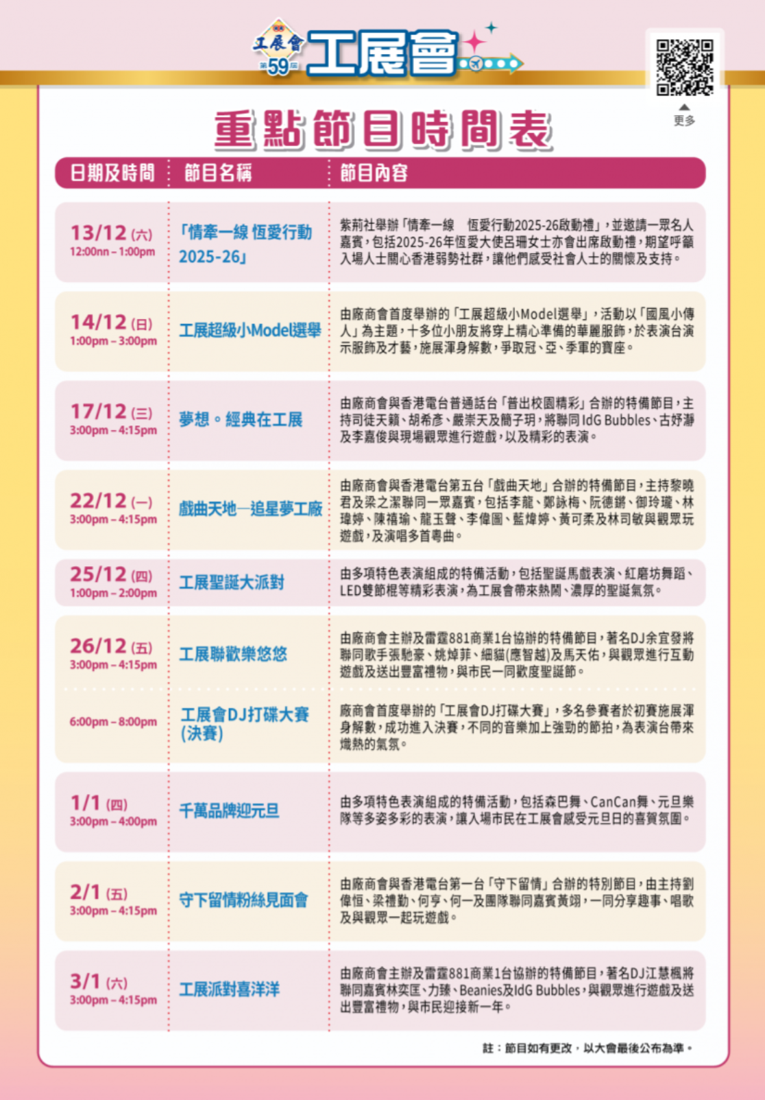 香港名牌選舉、香港服務名牌選舉、工展小姐選舉、工展超級小Model選舉、DJ打碟大賽、工展聖誕大匯演、萬千品牌迎元旦、「投票有機會贏巨獎」及電子消費抽獎活動。