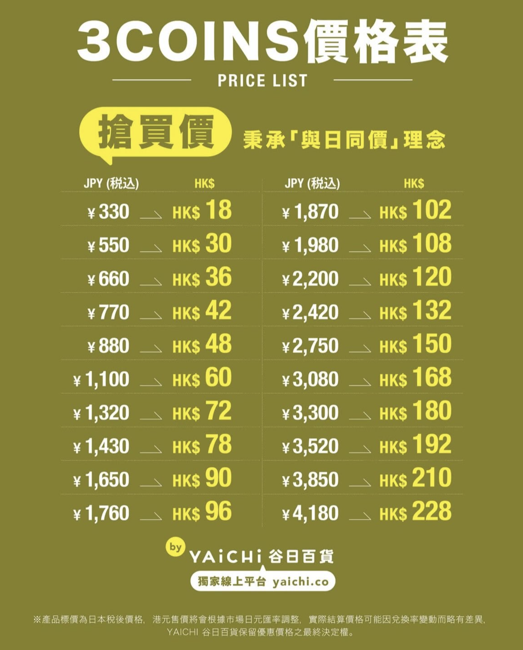 - 與日同價優惠:330日圓產品售$17(現時$18,減$1),其他貨品按比例調整,真正對標日本售價。