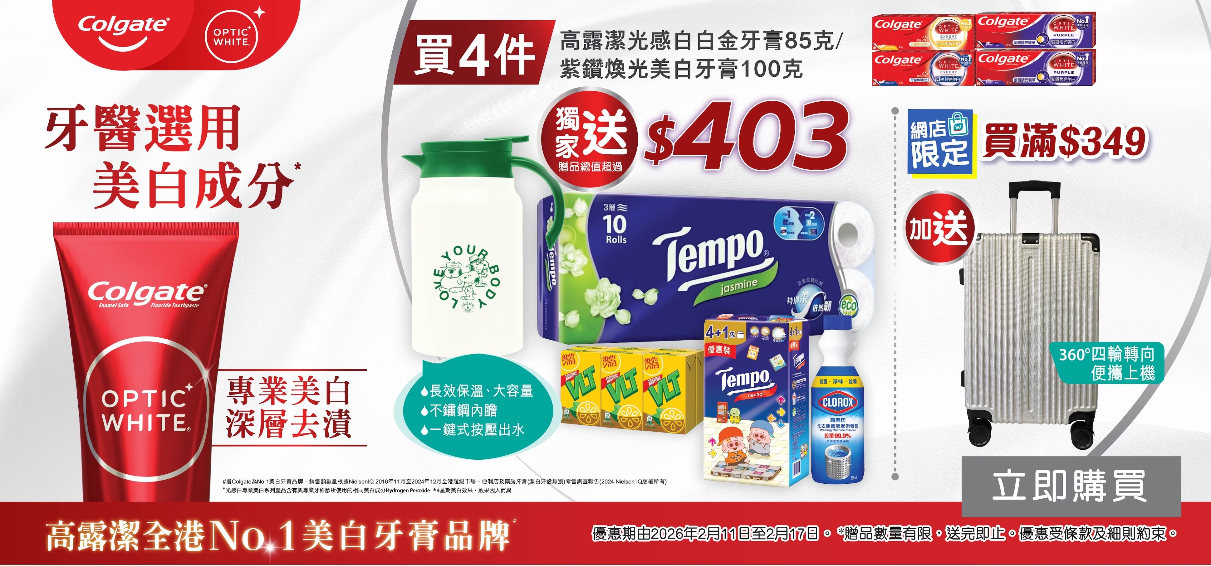 另外,於屈臣氏網店購買指定高露潔牙膏滿$349,即額外送20吋行李箱,總禮品價值高達$403,絕對划算!