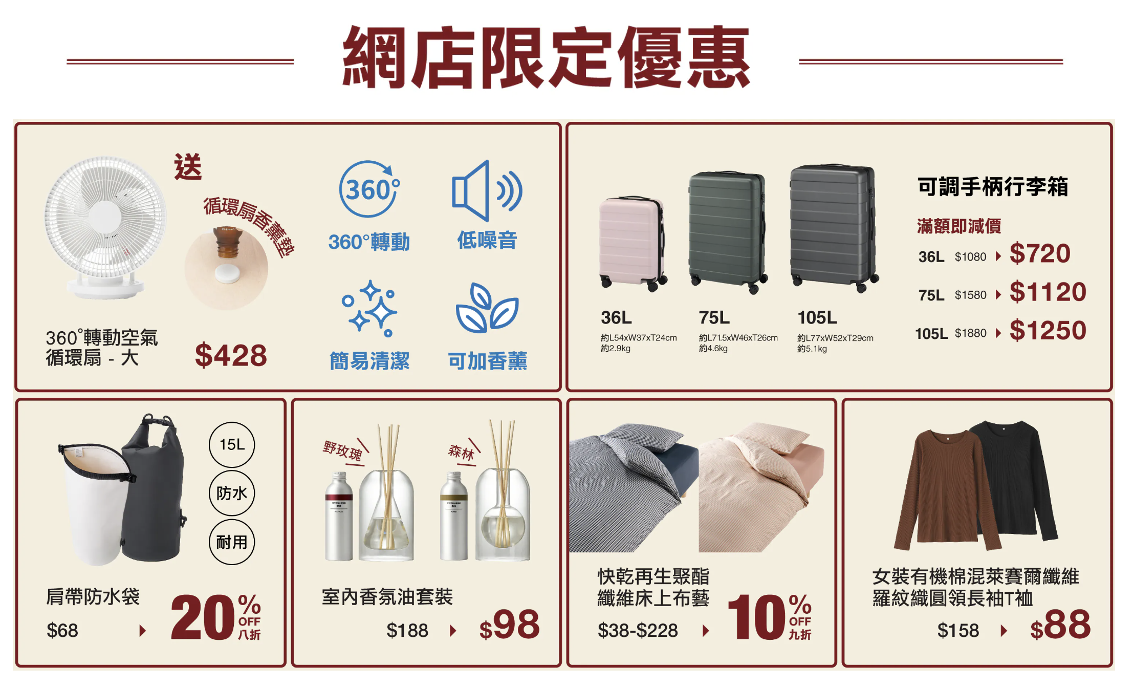 無印良品網店周年祭於2026年3月5日至9日一連5日舉行,只限香港官方網上商店。活動期間店舖自取訂單滿$100免運費,網購更享4重超值禮遇 。