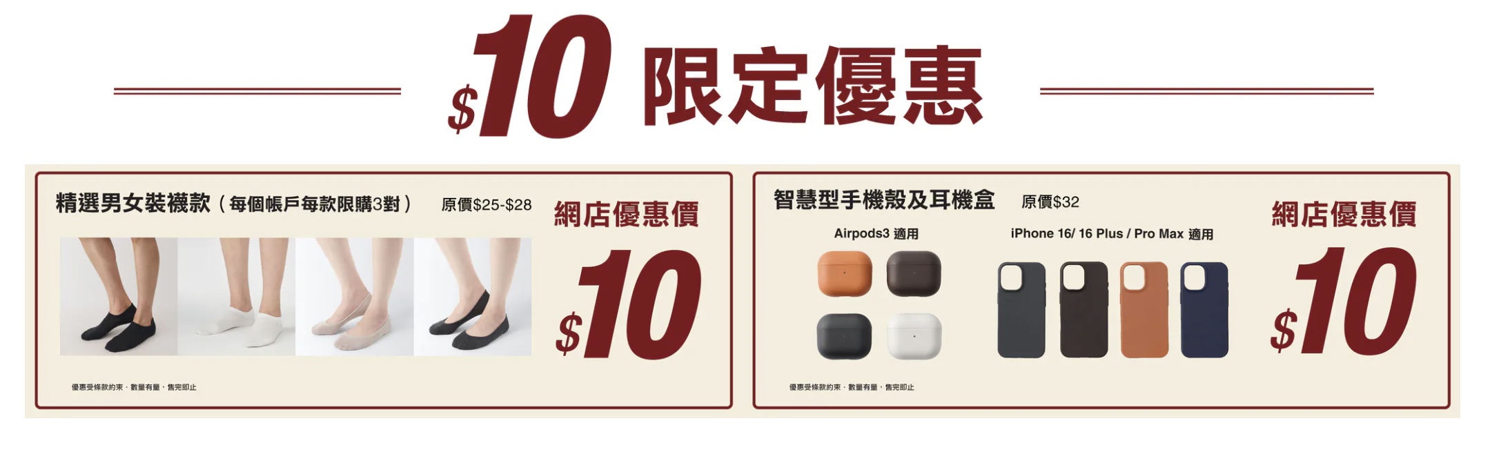 - 禮遇二:$10精選襪款 每個帳戶每款限購3對,平價必入。