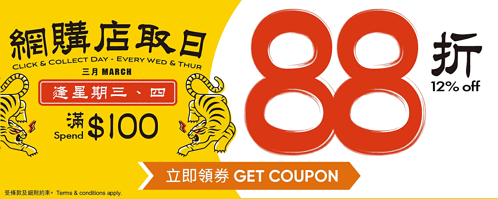 【超市優惠/超市著數/消費優惠/超市著數/惠康有折/惠康優惠/慳錢攻略】惠康超市再推限時超市著數,3月21日推出虎虎生「惠」大折日全港門市大折日,全單滿$168即享88折,人人有份、折扣無上限,同日紅白餐酒滿$300再有85折。 另外即日至3月26日逢星期三、四於惠康網購店選「網購店取」,單一購物滿$100即享8折,輕鬆掃平貨。