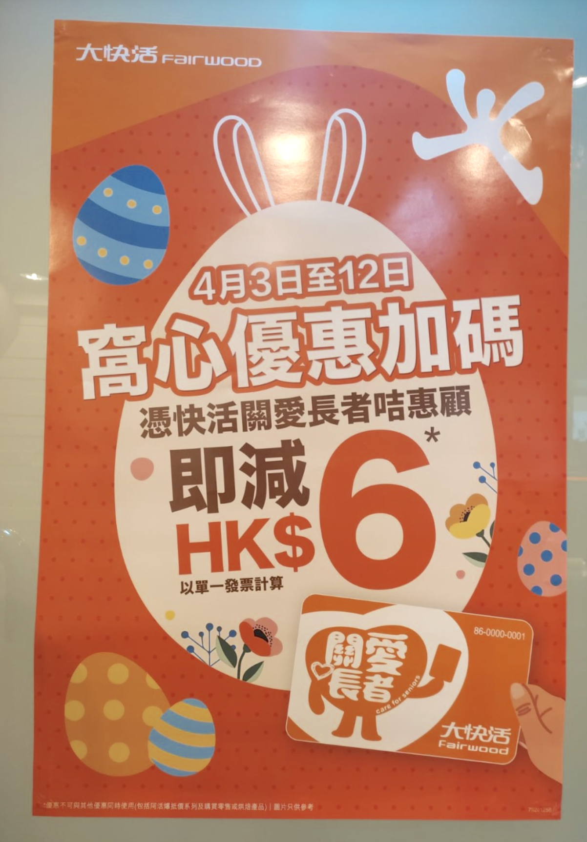 優惠內容:憑「快活關愛長者咭」惠顧,即減港幣$6。