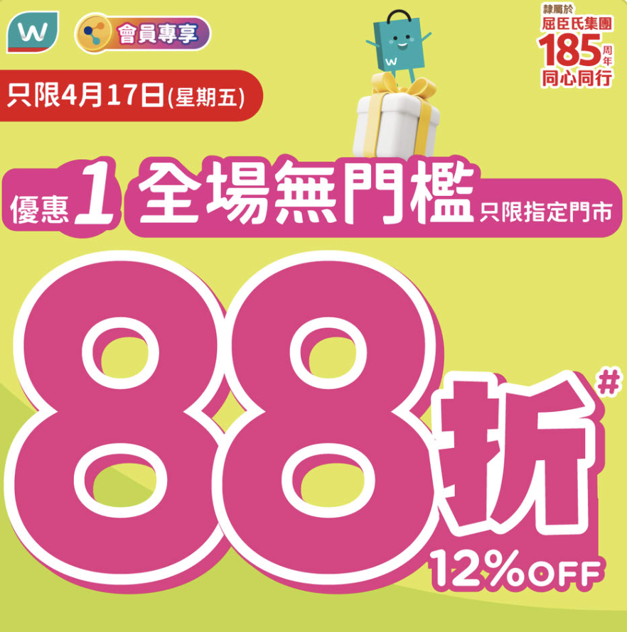 | 惠康 | 4月18日 | 滿$168全單88折無上限,紅白酒滿$300再85折 | - |