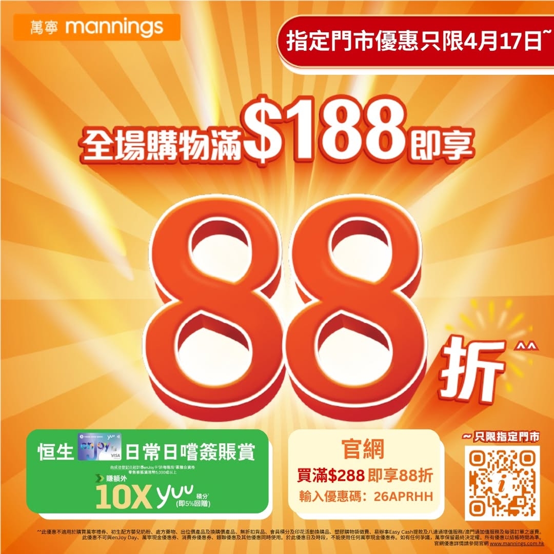 | 萬寧 | 4月17日 | 指定門市滿$188全單88折 | 滿$288碼「26APRHH」88折 |