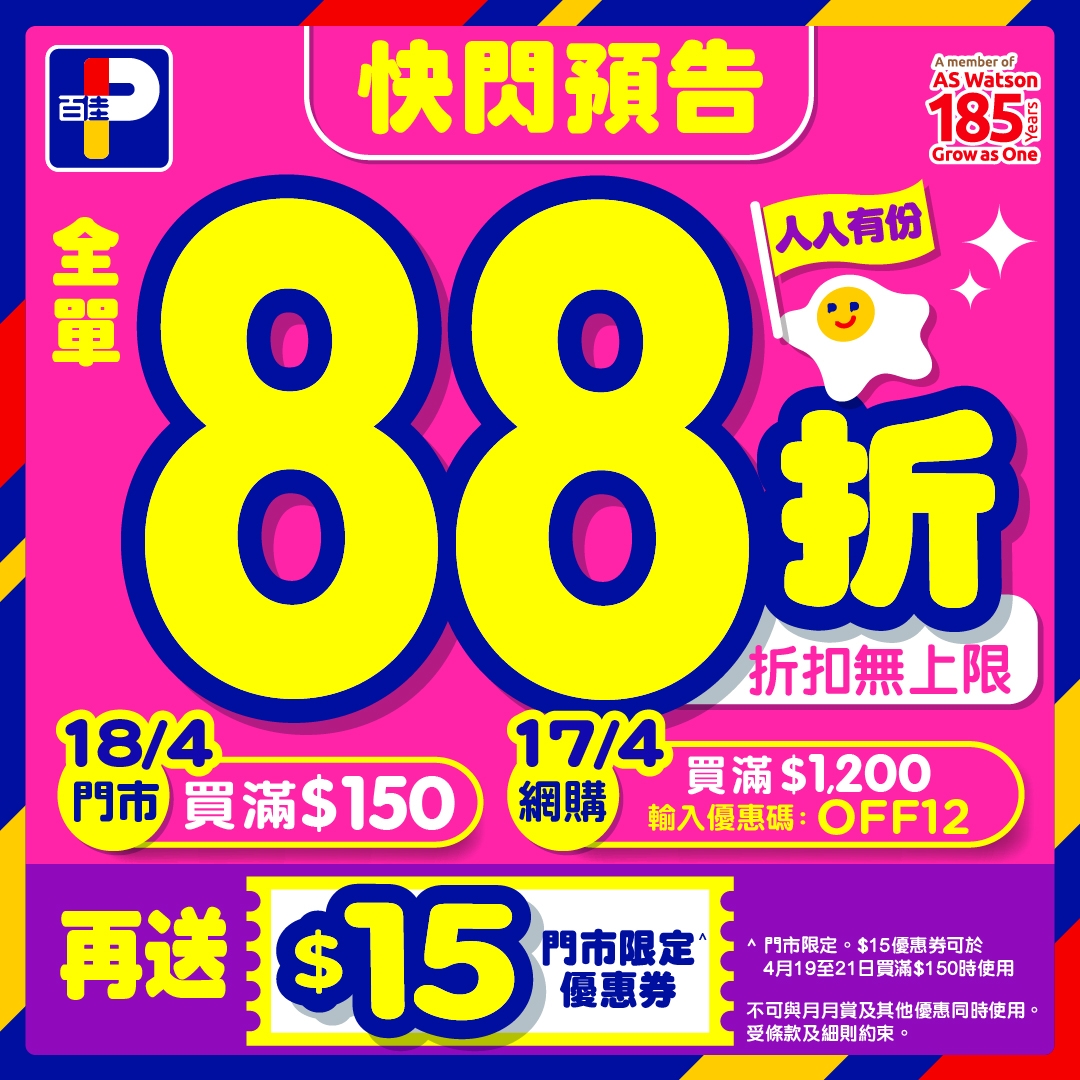 | 百佳 | 4月17至18日 | 滿$168全單88折無上限,4.18日滿$150享88折+送$15券 | 4.17日滿$1,200碼「OFF12」88折 |