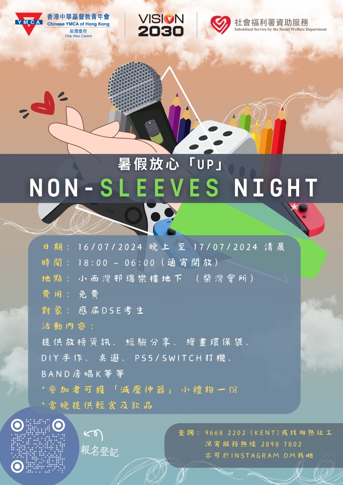 於放榜日前的晚上,YMCA柴灣會所將會通宵開放,提供放榜資訊、經驗分享、手作活動、桌遊及電子遊戲機、室內卡拉OK等,陪伴考生們度過緊張時刻。另外,YMCA小西灣會所亦將於逢星期五(包括7月12日、19日及26日)晚上,提供放榜支援、藝術及手作活動、飛鏢遊戲等,歡迎應屆考生到場放鬆減壓。