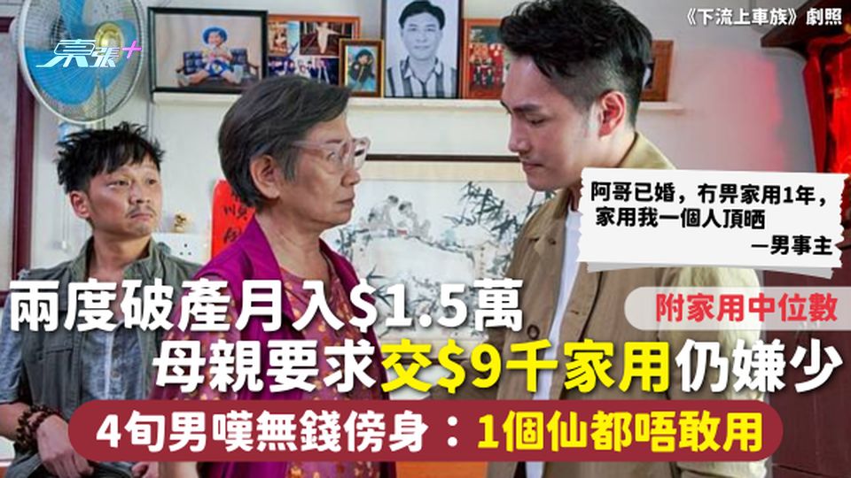 男事主透露自己跟母親同住,已婚哥哥已沒有交家用1年,直言「家用我一個人頂晒」。他指自己面臨第二次破產,破產期為期5年,每月要還3,300元予破產外判商,加上家用9,000元,即每月只剩2,500元自用,只好三餐留在家中吃,或每天帶飯上班慳錢,同時靠每月的傷殘津貼幫補。