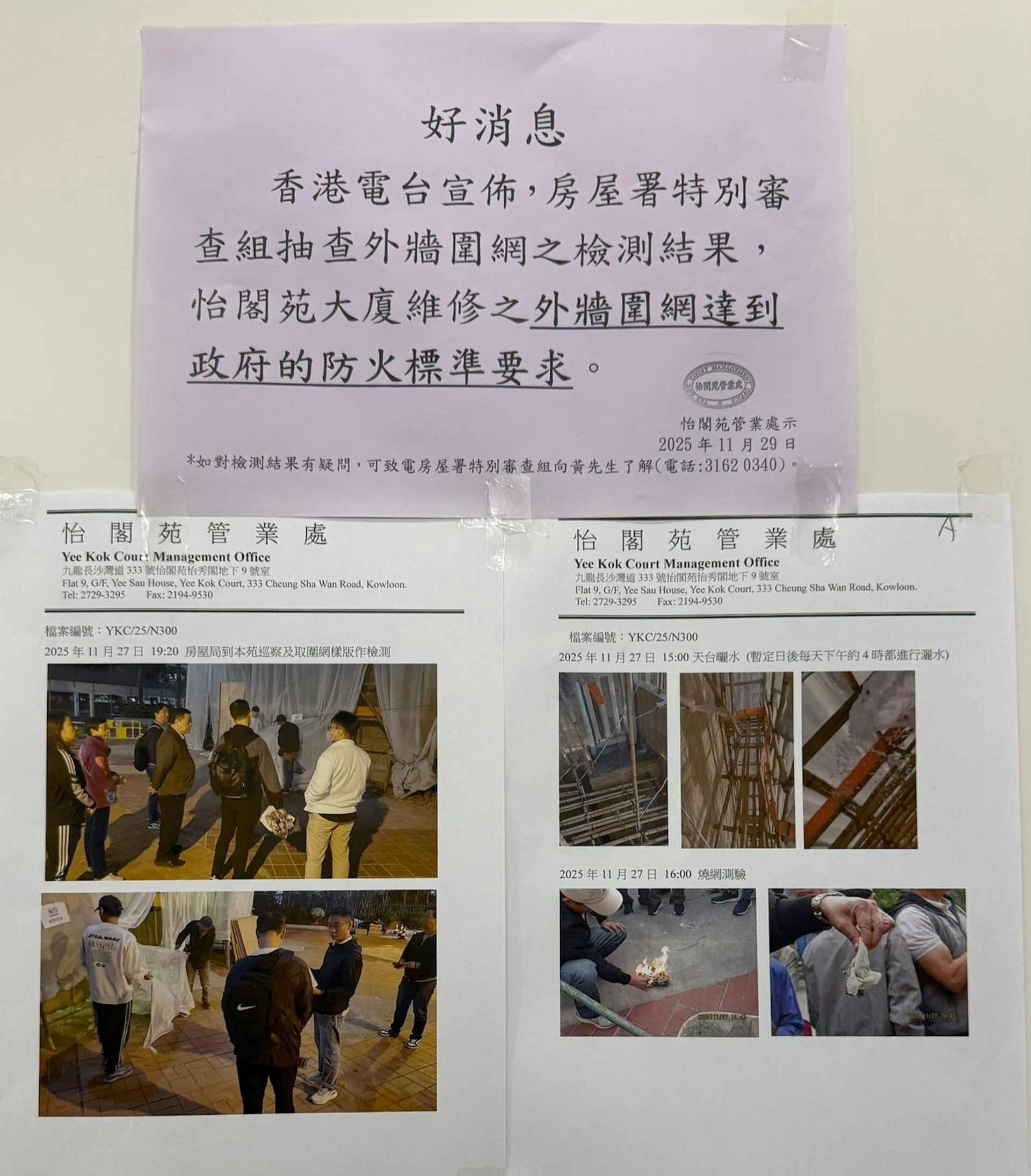 大埔宏福苑五級火已造成151人死亡(包括1名殉職消防員)、79人受傷,火勢焚燒超過43小時。政府最新化驗證實,宏福苑4座抽取的7個棚網樣本阻燃性全部不合格,經屋宇署及警方追查,確認該批致命棚網全部由山東宸旭化纖繩網有限公司生產及供應。事件令全港棚網安全亮紅燈,多個屋苑急貼「山東宸旭」合格報告自證清白,卻被《香港01》踢爆,長沙灣怡閣苑及柴灣峰華邨同廠棚網的2025年檢測報告全部造假,北京及濱州兩大檢測中心證實從未發出,令全港進行大維修工程的屋苑居民人人自危。