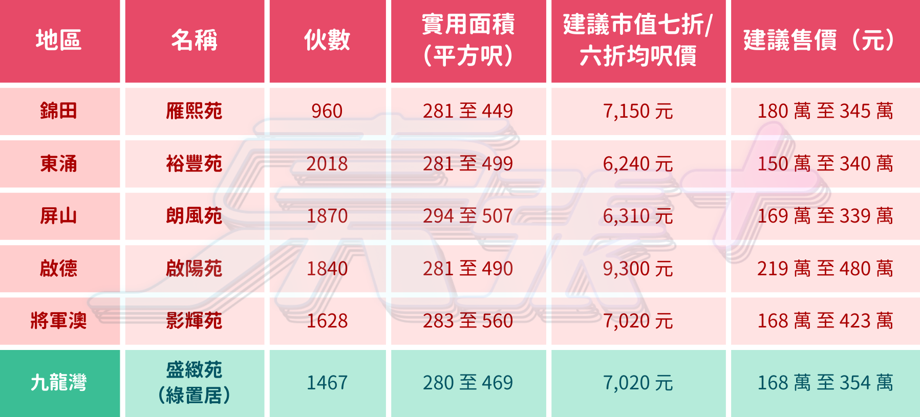 啟德啟陽苑:市區核心,鄰近港鐵宋皇臺站,交通便利,未來發展潛力大。面積介乎281至490平方呎,當中20%為464-490呎大單位,樓價介乎219-480萬