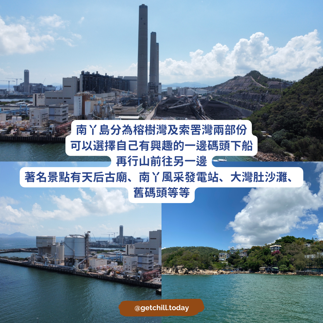 南丫島分為榕樹灣及索罟灣兩部份可以選擇自己有興趣的一邊碼頭下船再行山前往另一邊著名景點有天后古廟、南丫風采發電站、大灣肚沙灘、舊碼頭等等