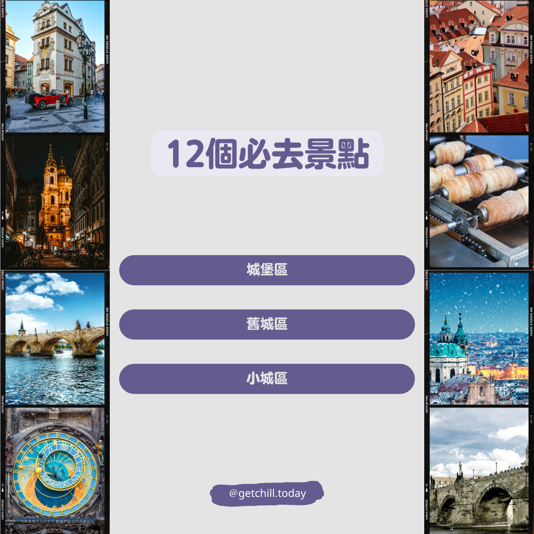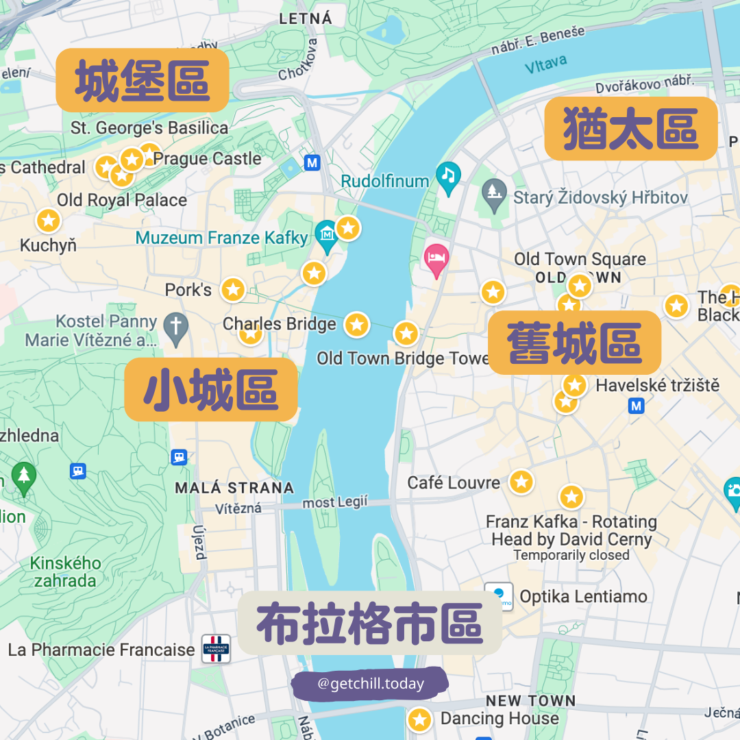 布拉格主要有城堡區、小城區、舊城區和猶太區四個旅遊景點聚集地