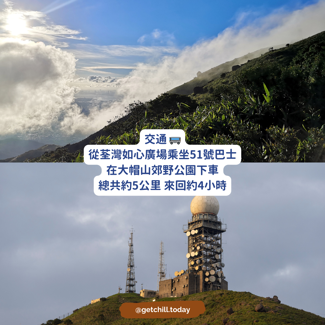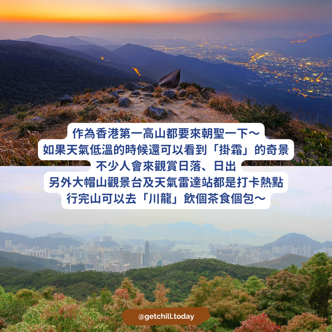作為香港第一高山都要來朝聖一下~如果天氣低溫的時候還可以看到「掛霜」的奇景不少人會來觀賞日落、日出另外大帽山觀景台及天氣雷達站都是打卡熱點行完山可以去「川龍」飲個茶食個包~全部都係自助式:自己斟茶、自己揀茶葉、自己揀點心、自己調味、拎埋位剛剛出爐嘅點心好香好味全部都好大件蝦餃、金錢肚、牛肉球、牛柏葉都係唔錯嘅選擇交通 🚌從荃灣如心廣場乘坐51號巴士在大帽山郊野公園下車總共約5公里 來回約4小時