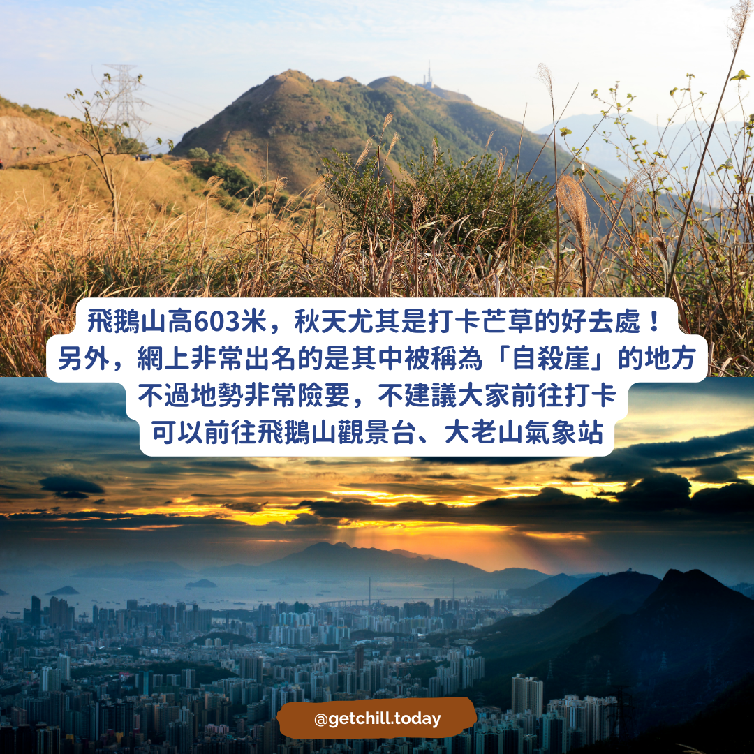 飛鵝山高603米,秋天尤其是打卡芒草的好去處!另外,網上非常出名的是其中被稱為「自殺崖」的地方不過地勢非常險要,不建議大家前往打卡可以前往飛鵝山觀景台、大老山氣象站交通 🚌1號或者1A小巴,於飛鵝山道路口落車,再登山徑拾級而上