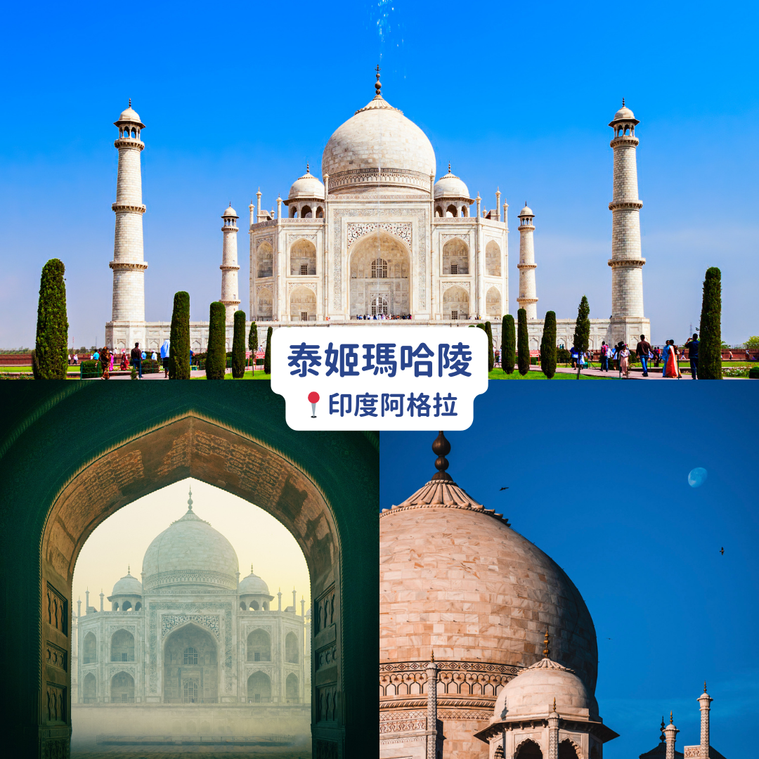 泰姬陵在印度北方邦阿格拉市,亞穆納Yamuna河右岸,距離首都新德里210公里,被列為世界新七大奇蹟之一。