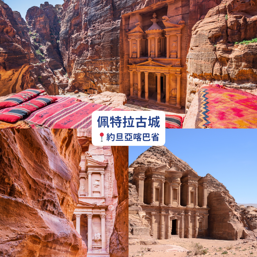 約旦的佩特拉古城,位於安曼南250公里處,是絲路必經之路,曾因貿易而繁榮,後因地震而荒廢,被選為世界新七大奇蹟之一。