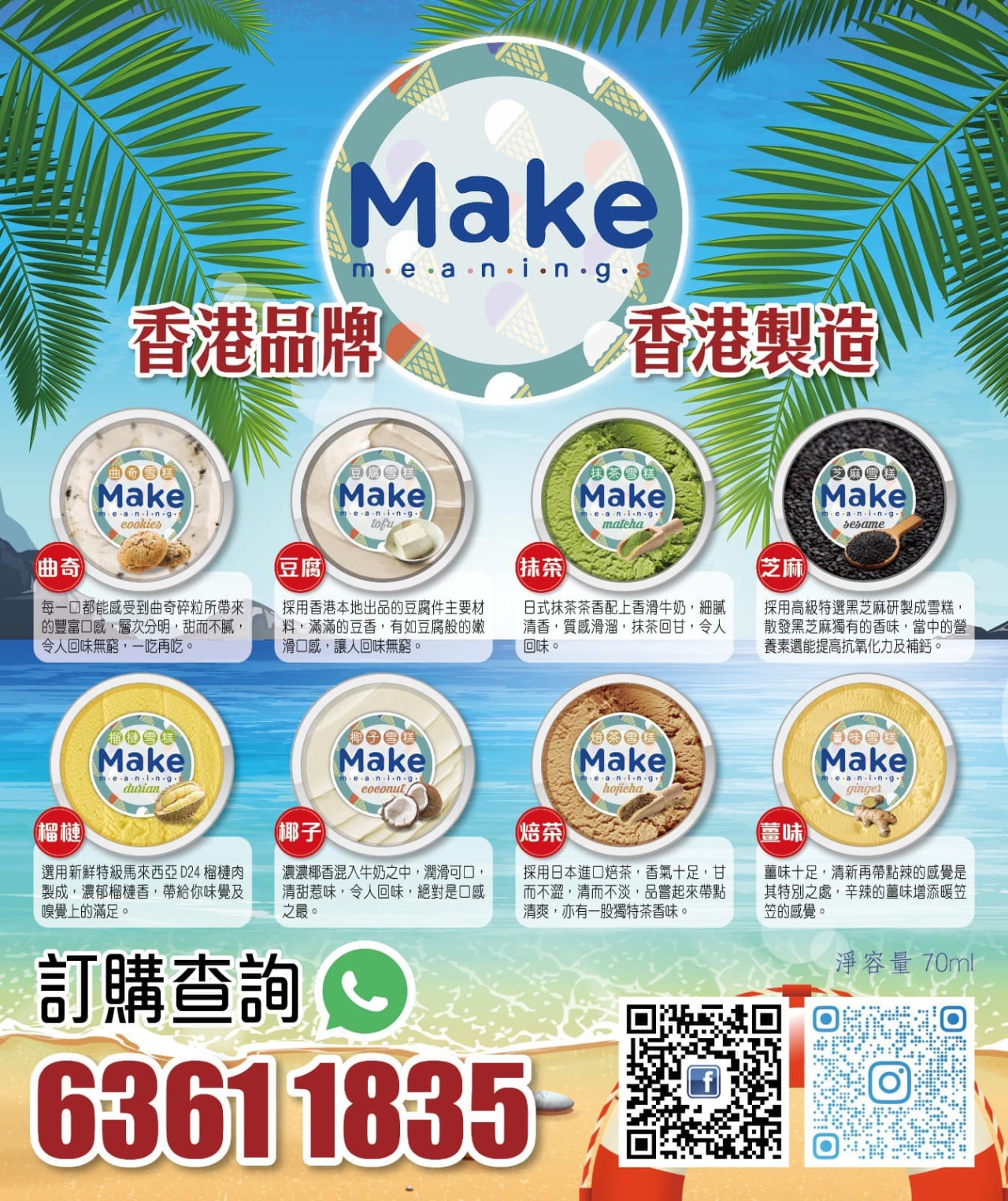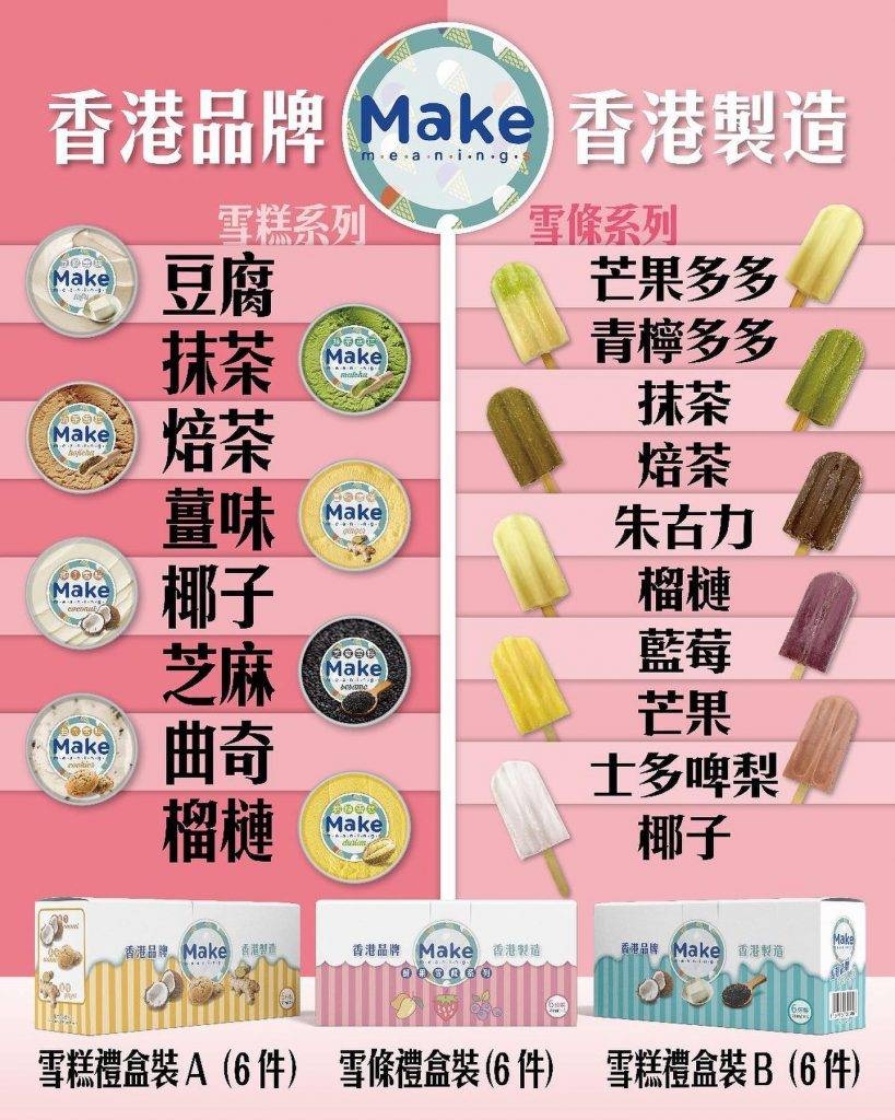 香港本地雪糕品牌「MAKE Meanings」在本地自設廠房,主打不含防腐劑、不含添加香精、成份天然健康的「香港製造」雪糕雪條。雪糕系列口味眾多,包括雲呢拿、朱古力、士多啤梨、豆腐、焙茶、榴槤等;而雪條選擇則有椰子、士多啤梨、芒果、藍莓、榴槤、朱古力、焙茶、抹茶、芒果多多、青檸多多等,有些口味更不是大眾化,好有創意和新鮮感。