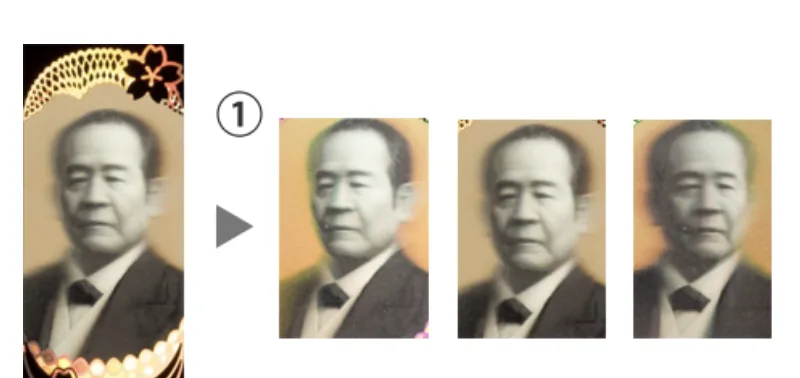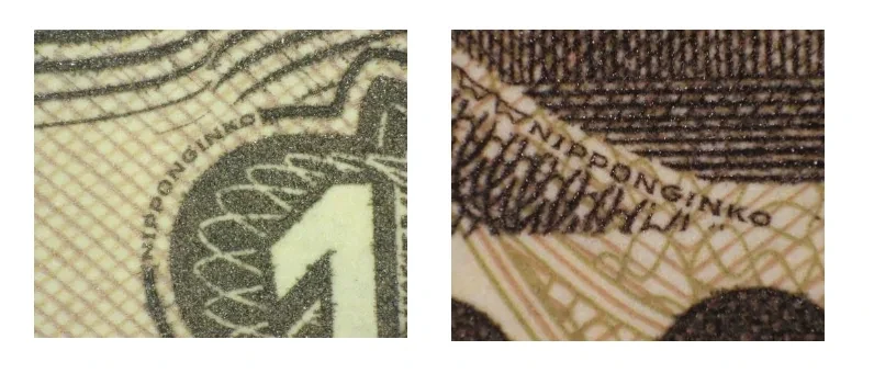 除了油墨外,還採用微縮印刷技術,紙鈔精細花紋背景上印有微縮文字「NIPPONGINKO」(日本銀行),一般彩色影印機難以複印;利用油墨推疊令肖像、額面數字和「日本銀行券」等主要圖案略微凸起,觸摸時帶粗糙感;鈔票左右兩側,採用雕刻凹版印上多條斜線凸起圖案,以便視障人士憑觸摸識別。