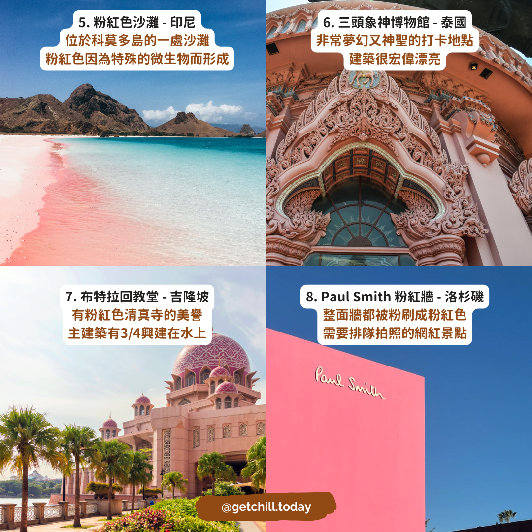 位於印尼科莫多島。沙灘的粉紅色是由一種叫做孔蟲 (Foraminifera) 的微生物引起的,這種微生物的外殼在沙灘上形成了粉紅色的沙子。