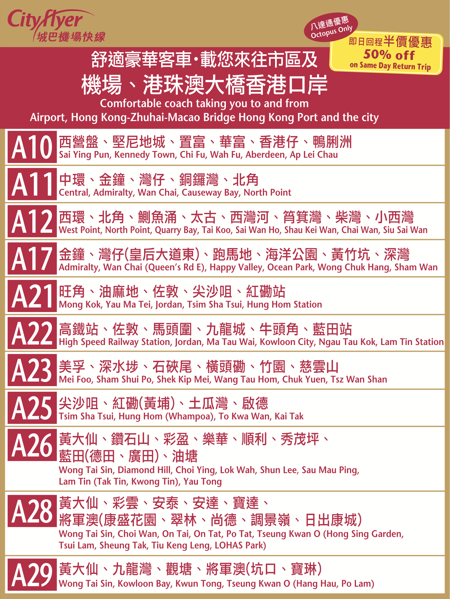 先乘坐城巴機場快線前往港珠澳大橋香港口岸,巴士列表: